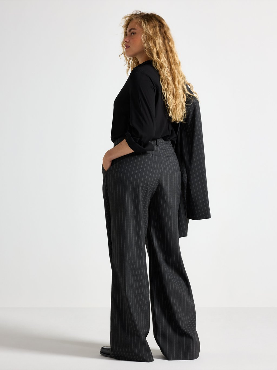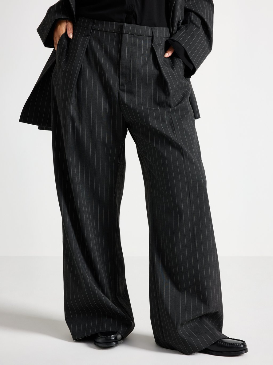Wide pinstriped trousers with low waist. Wide legs Low waist Contains 51% recycled polyester Inside leg measurement 77 cm on all sizes 98% pólýester 2% elastan