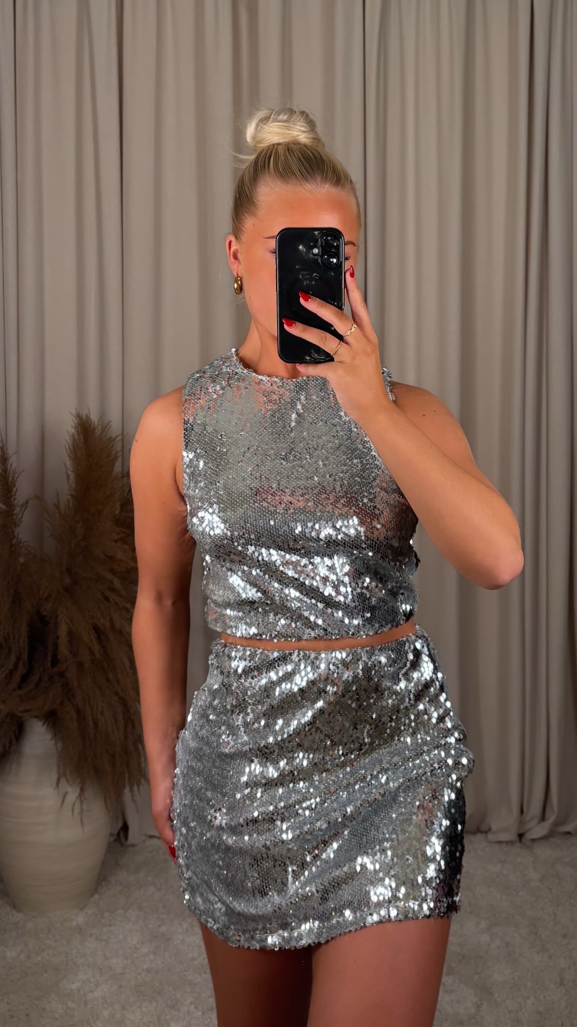 Æðislega flott pallíettu pils úr mjög þæginlegu efni, það er lítil teygja í efninu og er með rennilás á hliðinni modelið er 168cm og er í stærð S