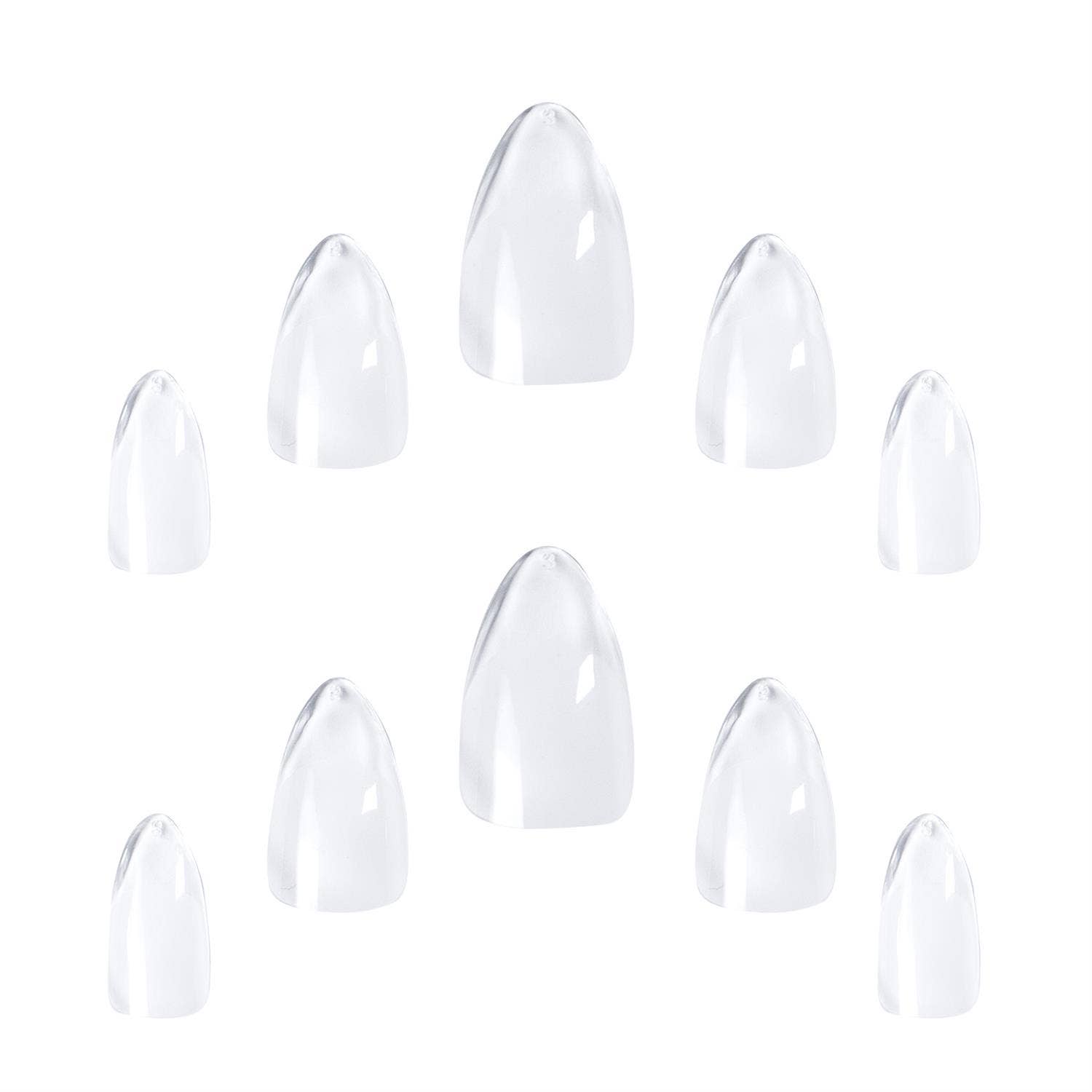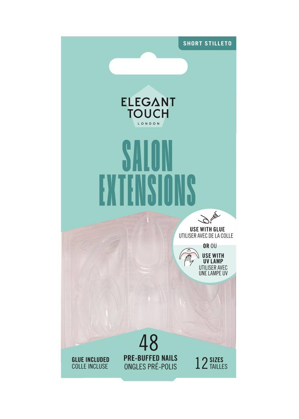 Salon Extensions neglurnar koma í miðlungslengd í short stiletto lagi með glansandi áferð. Neglurnar eru glærar að lit og henta fullkomlega til að naglalakka eða skreyta að eigin vild.
