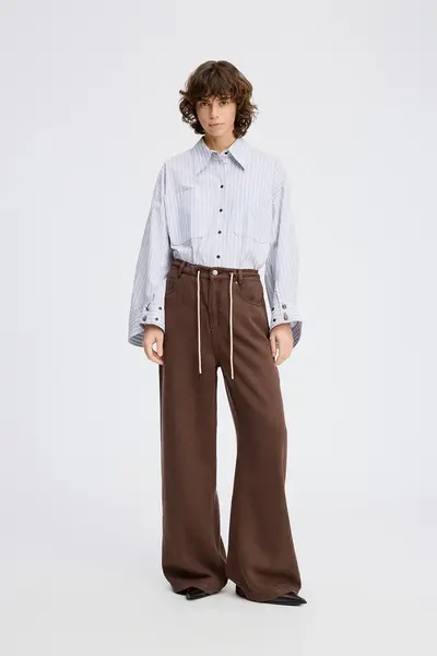 Víðar gallabuxur frá Munthe. Módelið er 177 cm og í stærð 36.