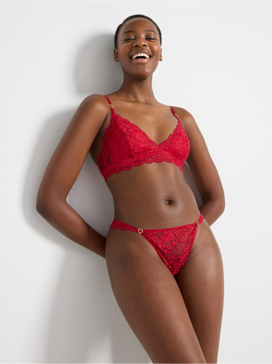 Thong in lace with a low waist and high leg cut. Low waist Lined crotch Scalloped edge Contains 55% recycled polyamide 91% pólýamíð 9% elastan