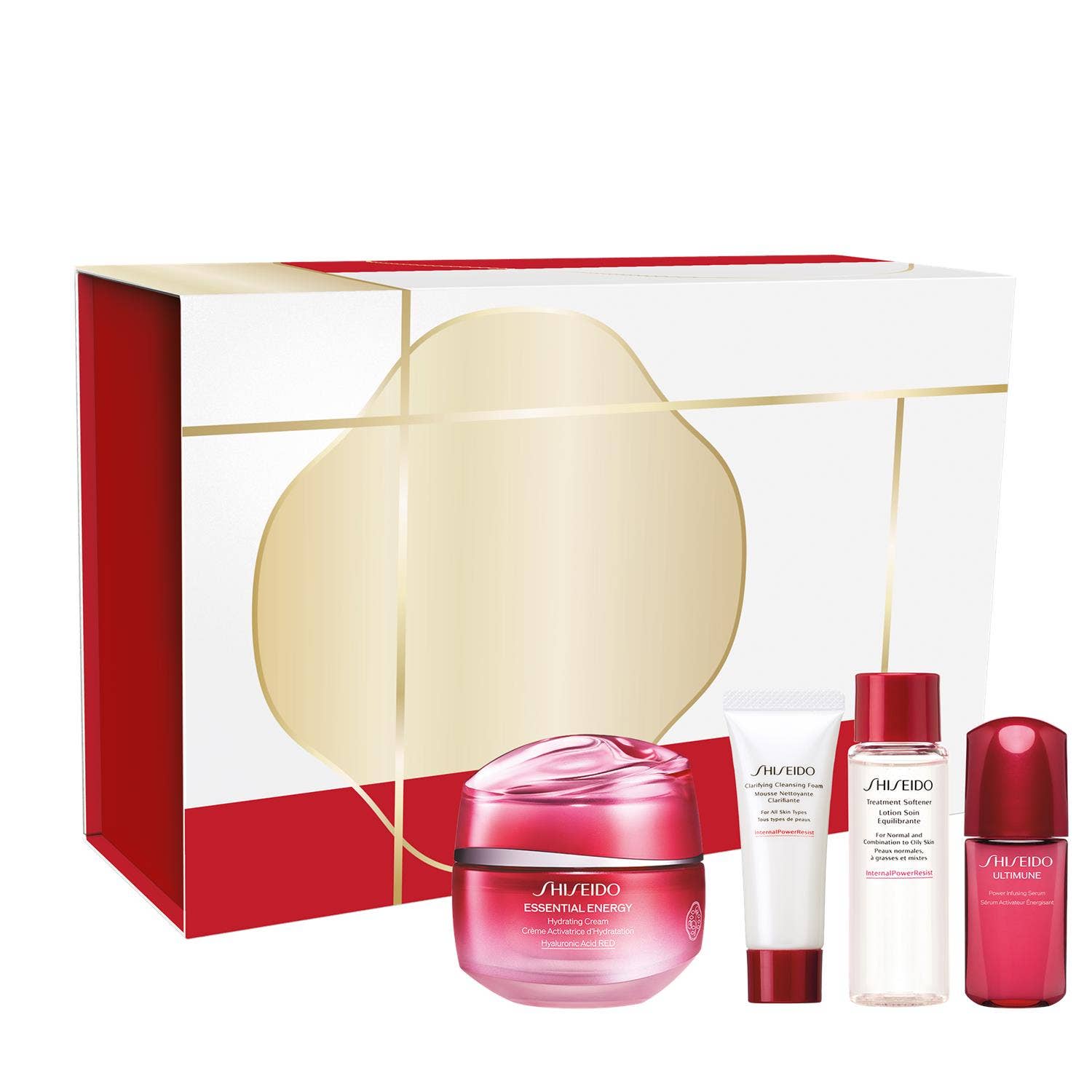Gjfakassi sem inniheldur Essential Energy Hydrating Cream í fullri stærð ásamt Clarifying Cleansing Foam (ferðastærð), Treatment Softener (ferðastærð og ULTIMUNE Power Infusing Serum ( ferðastærð)