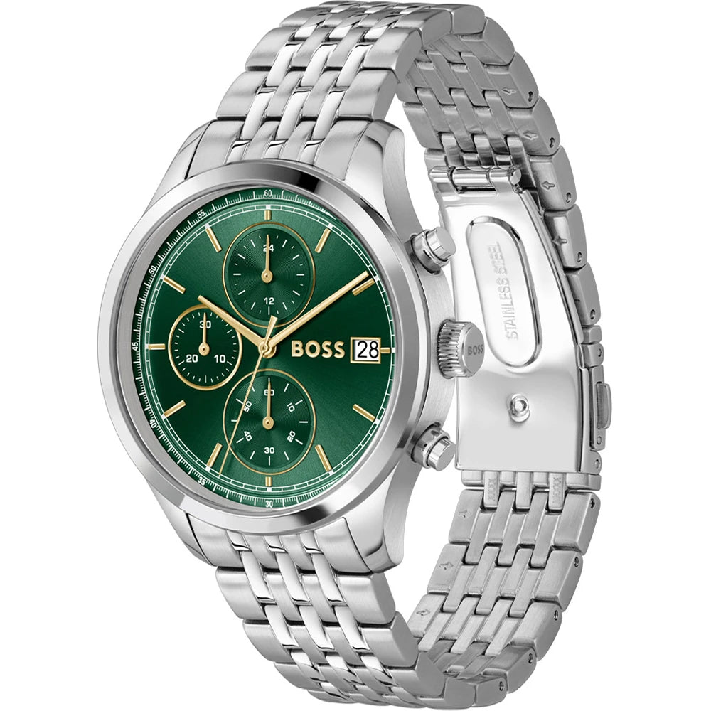 Boss Stratus Chronograph Vörunr:1514330 Fallegt herraúr frá Hugo Boss. Gangverk:Rafhlaða/Quartz Stærð:41mm Úrkassi:Stál   Keðja/ól:Stál  Skífa:Græn Gler:Hert gler Vatnsvörn:50m Dagatal:Já  ... Sjá nánar