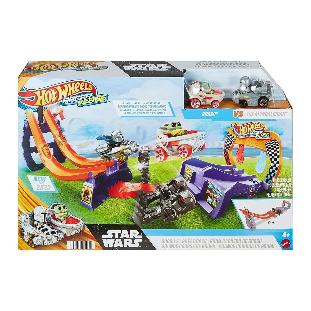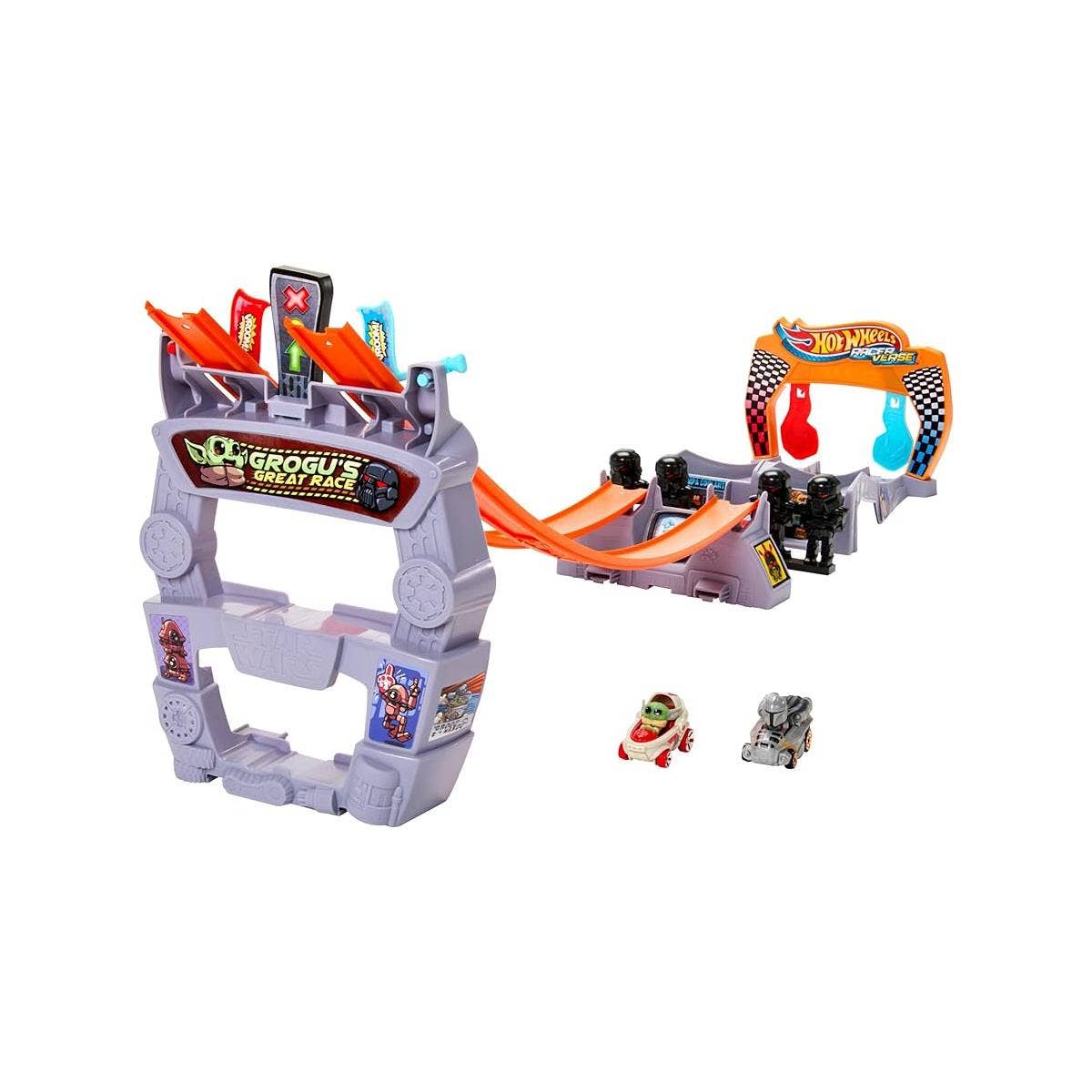 Skemmtileg Star Wars bílabraut frá Hot Wheels. Hvor kemur fyrst í mark Grogu eða The Mandalorian?