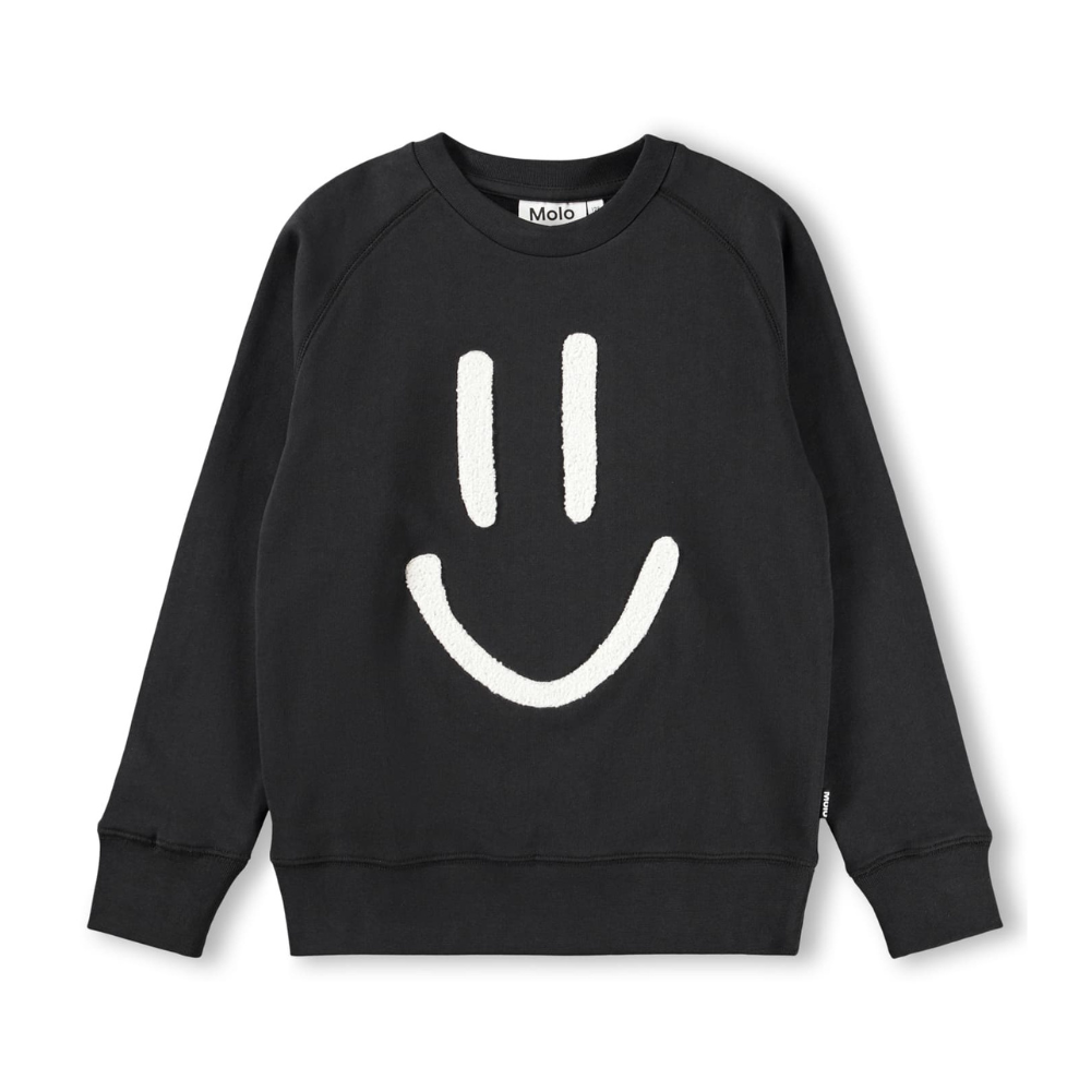 Svört jogging peysa með hvítum broskalli að framan. Stroff við ermar og mitti. 100% bómull.