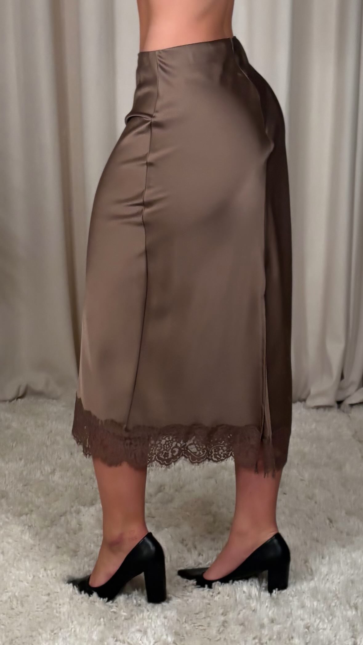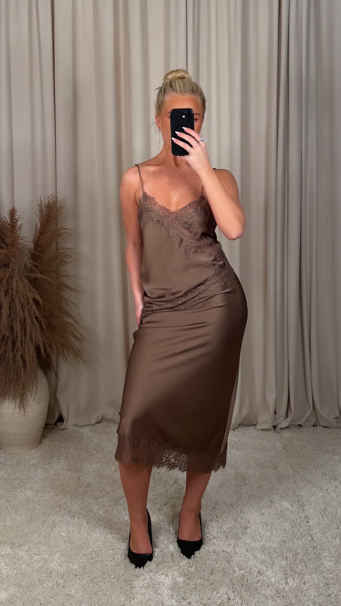 Æðislega fallegt pils úr mjög mjúku satín efni, það er engin teygja í efninu og er með rennilás að aftan  modelið er 168cm og er í stærð M