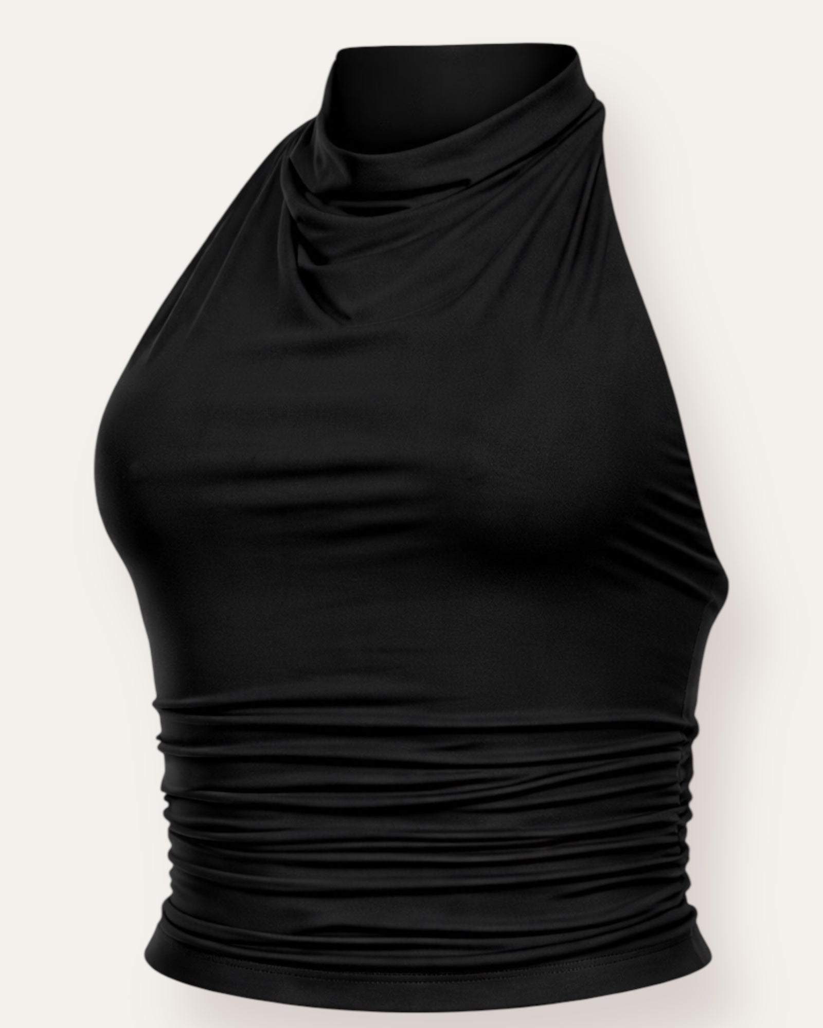 Halter Draped Crop Top  Stílhreinn og kvenlegur halter toppur með fallegri draperingu sem fellur mjúklega yfir bringu og leggst að líkamanum. Hátt hálsmál gefur fágað yfirbragð á meðan ... Sjá nánar