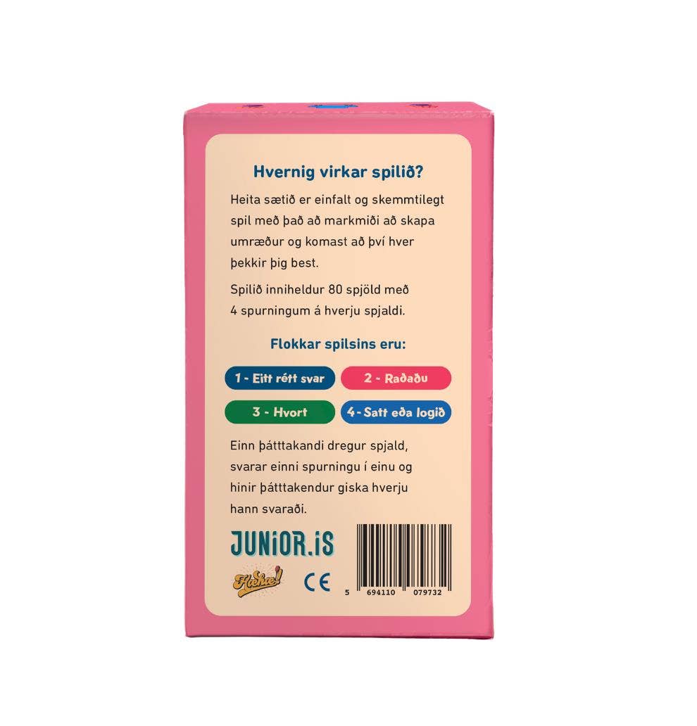 Heita Sætið 2 er einfalt og skemmtilegt spil með það að markmiði að skapa umræður og komast að því hver þekkir þig best.