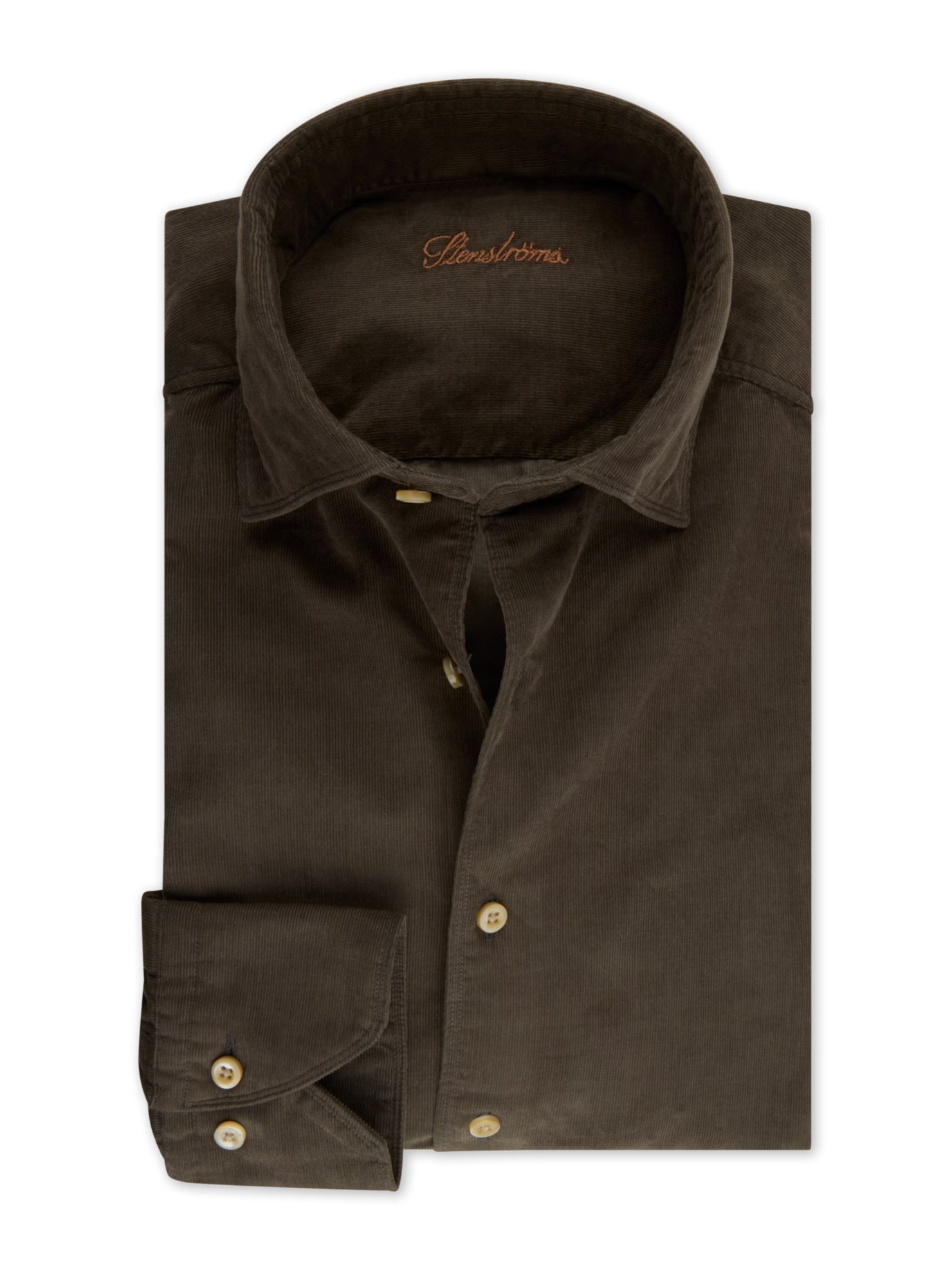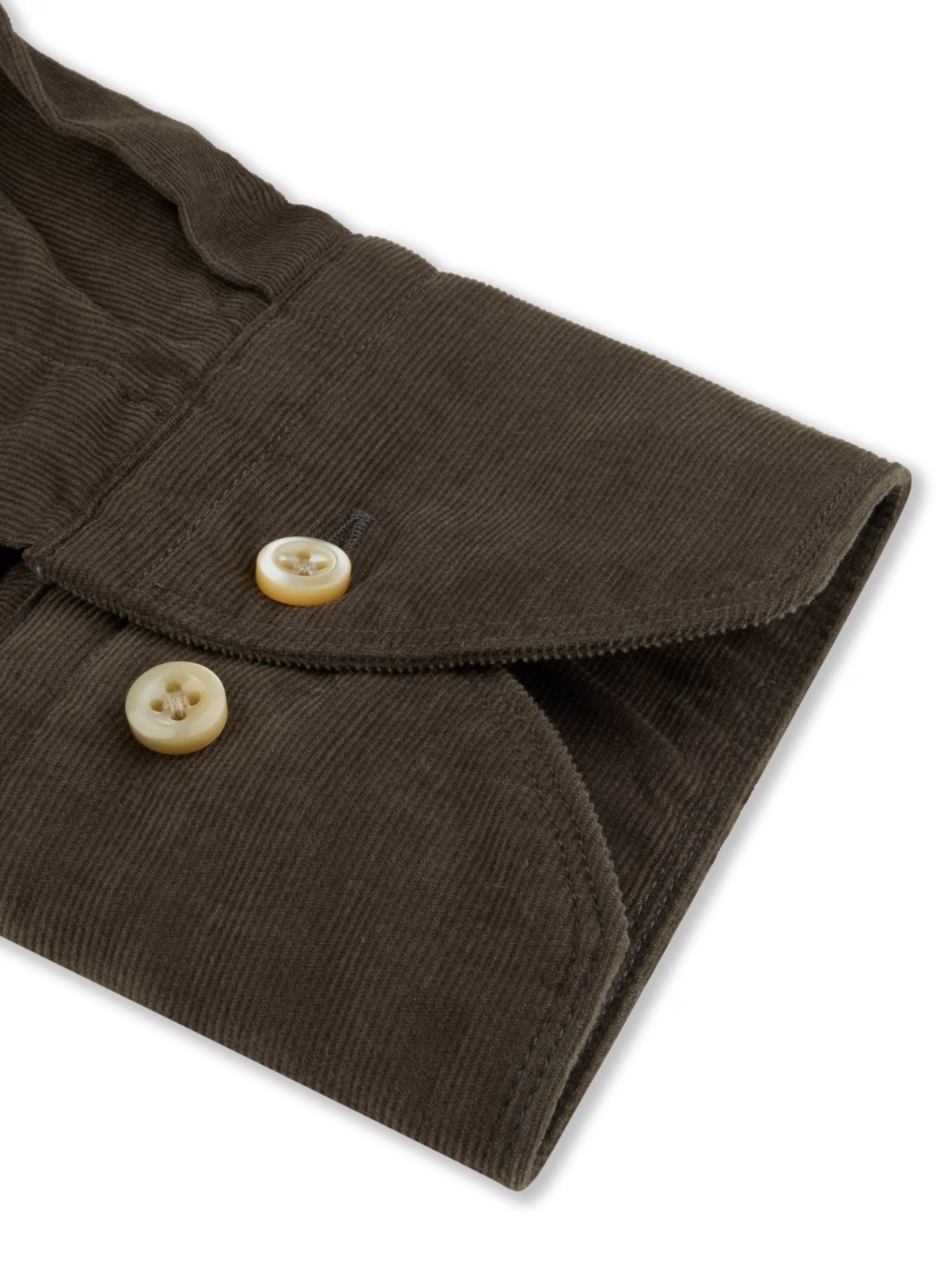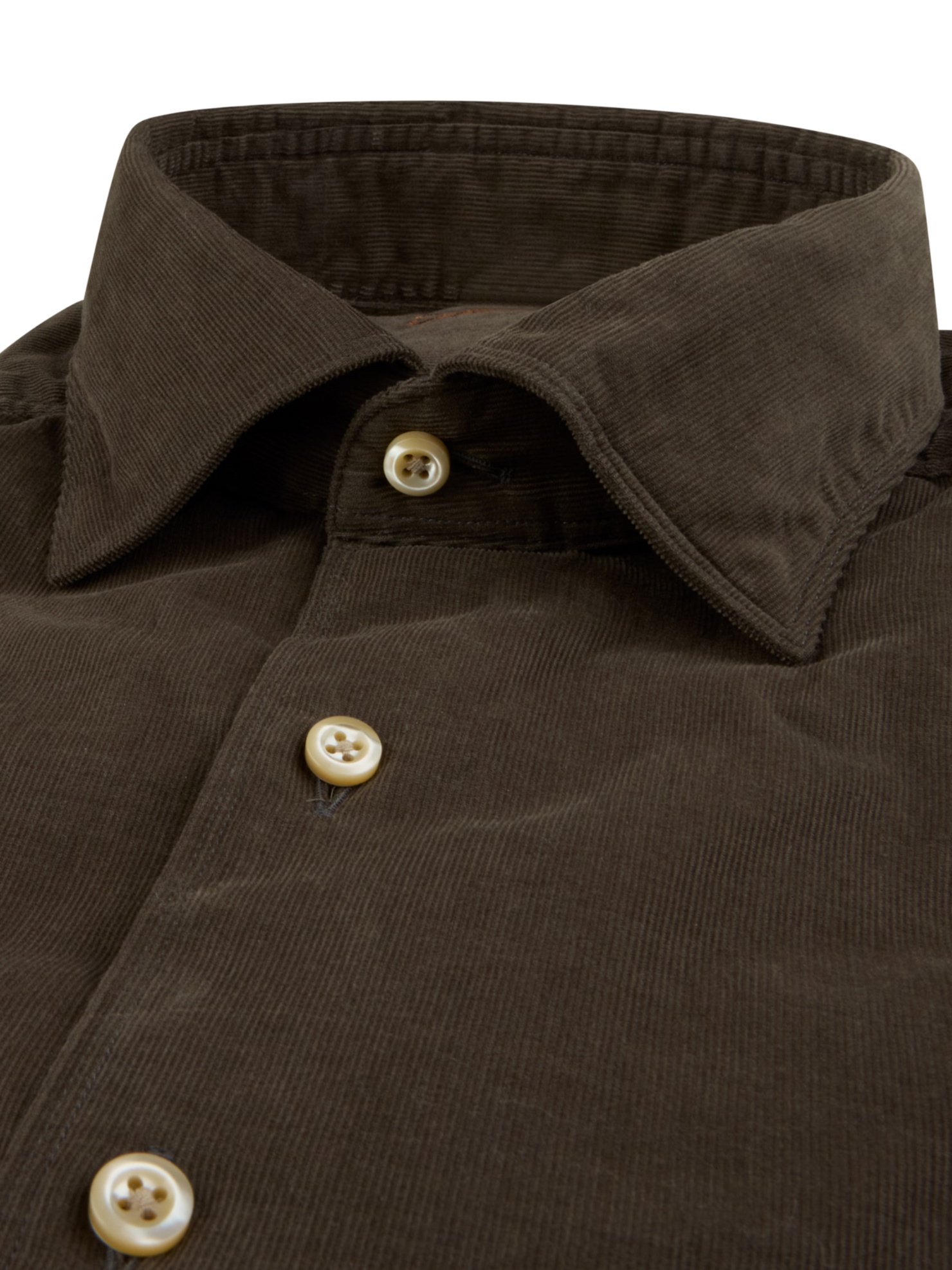 This corduroy shirt is made of cotton and is detailed with mother of pearl buttons, singel cuffs and a cut away collar. Moderate cut away collar, No.72 Single Cuff Babycord Cotton 100%