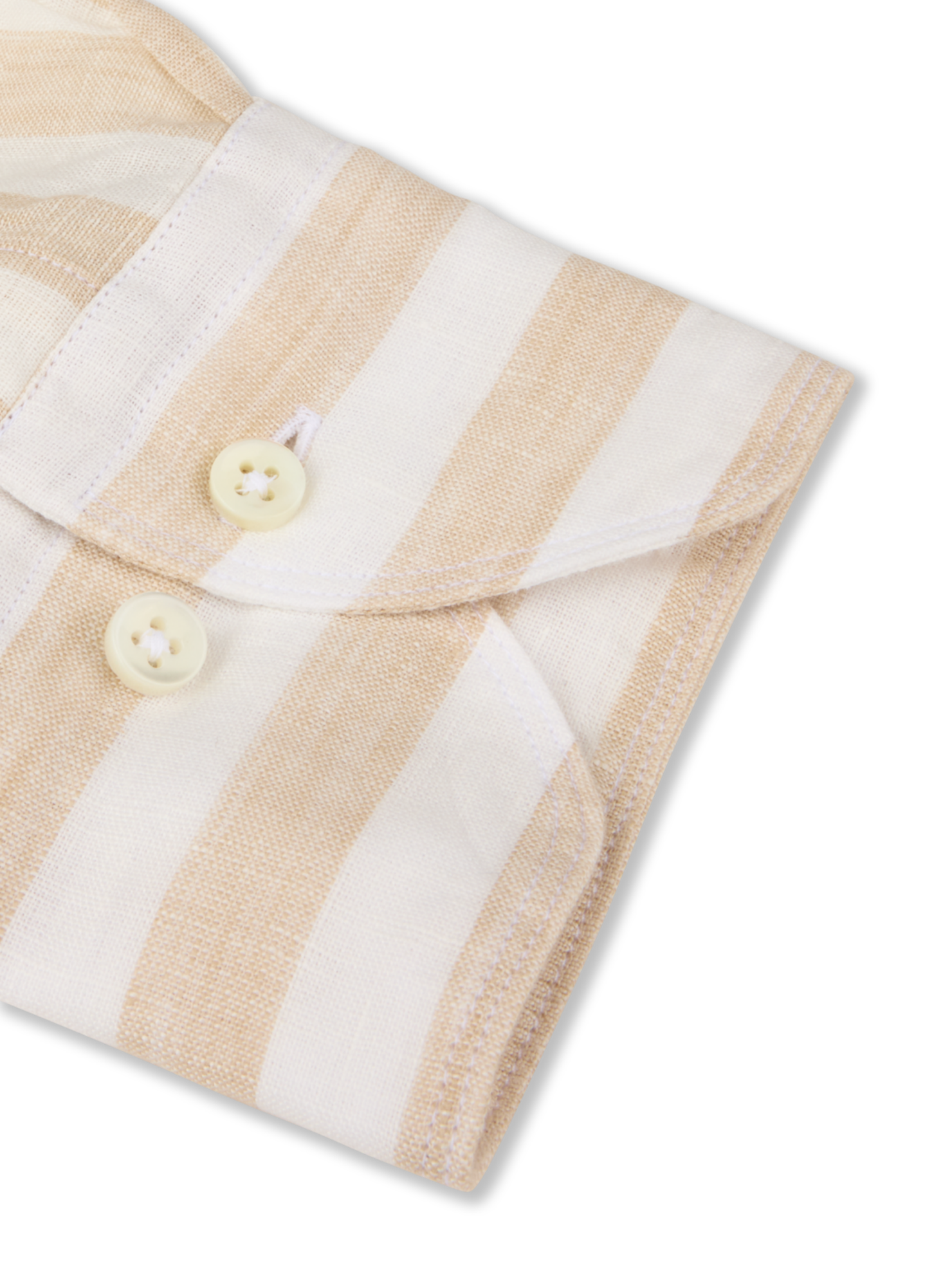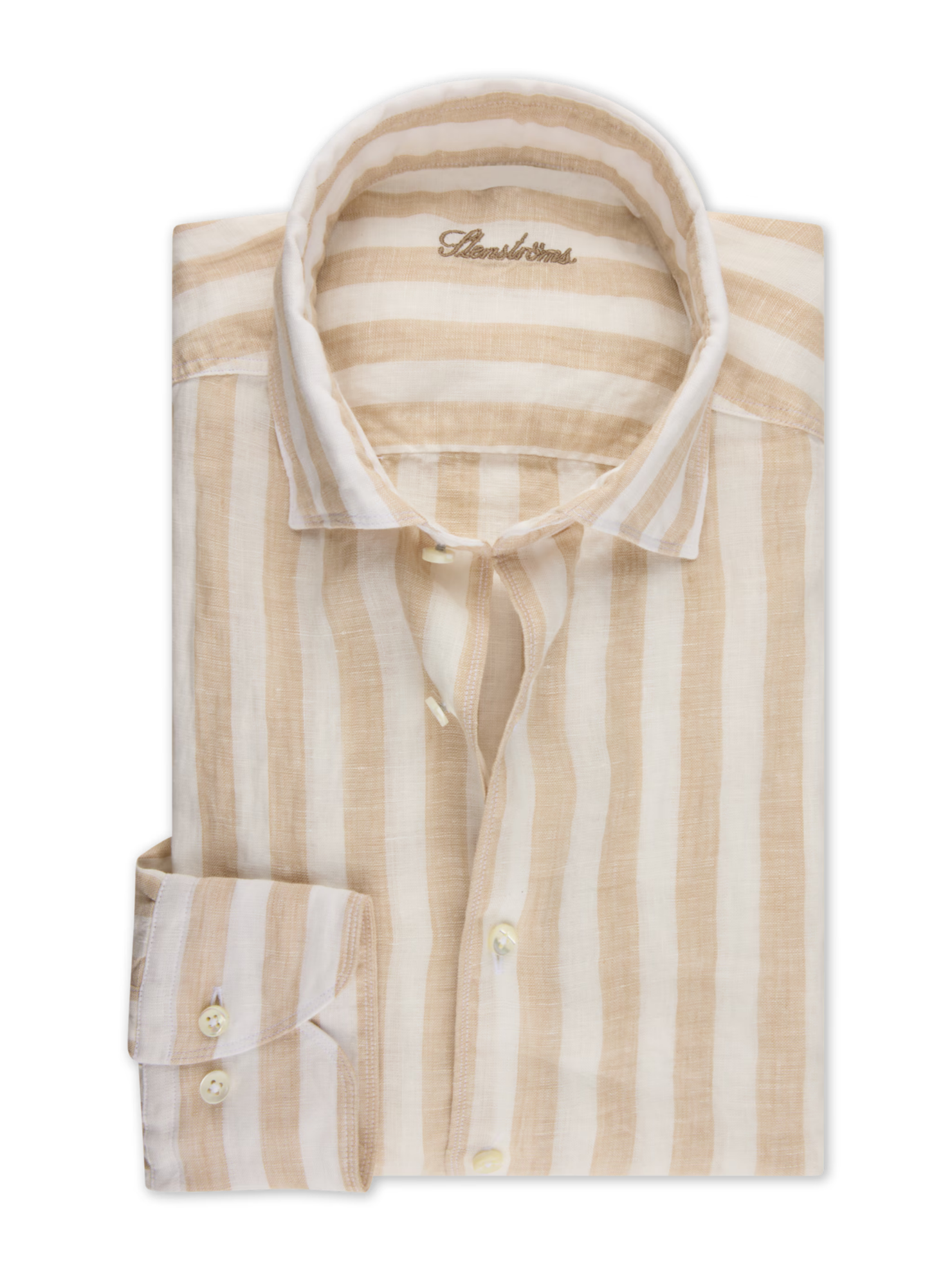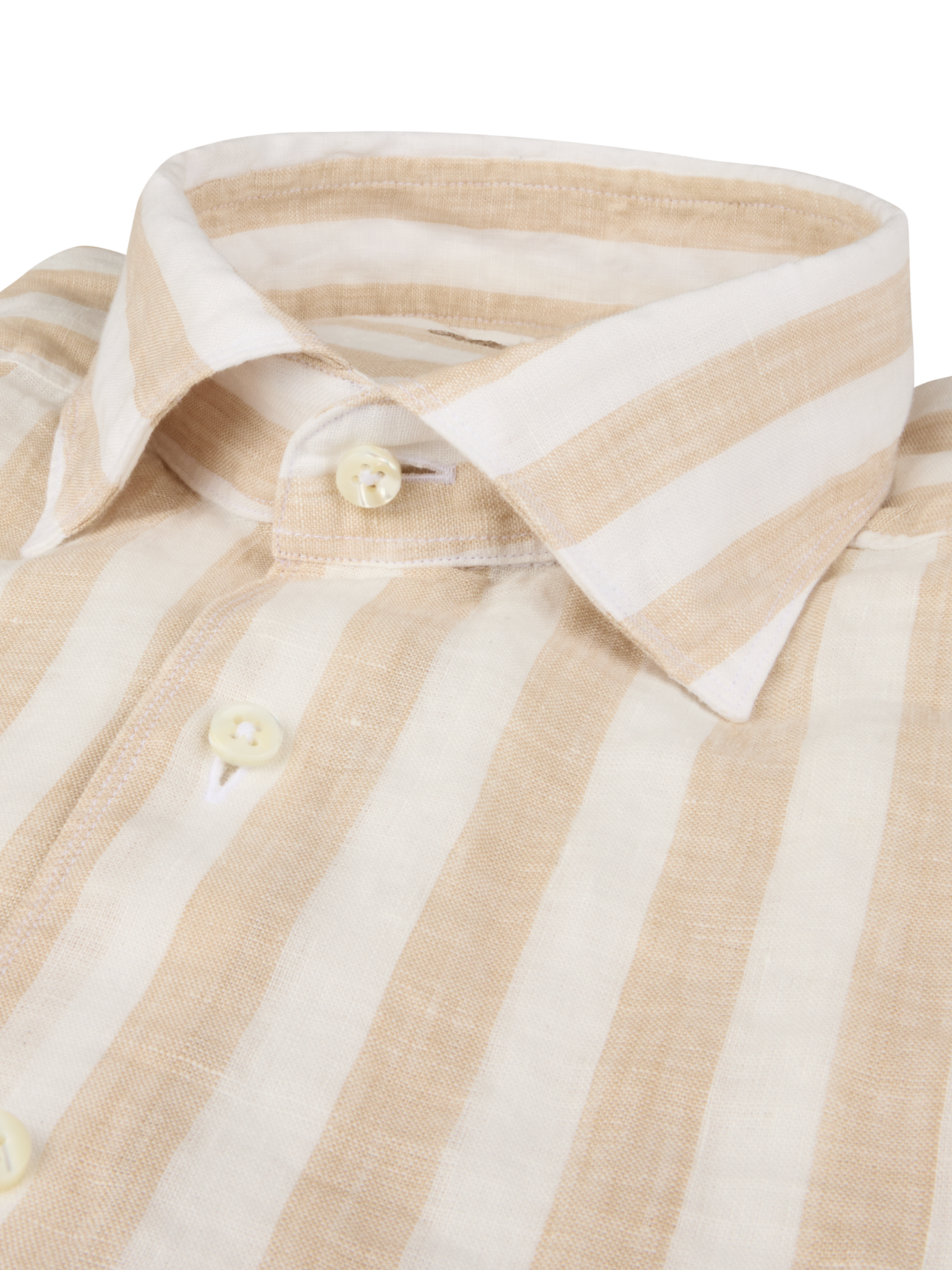 This striped shirt is made of linen and is detailed with mother of pearl buttons, single cuffs and a cut away collar. Moderate cut away collar, No.72 Single Cuff Mother of Pearl Buttons Linen 100%
