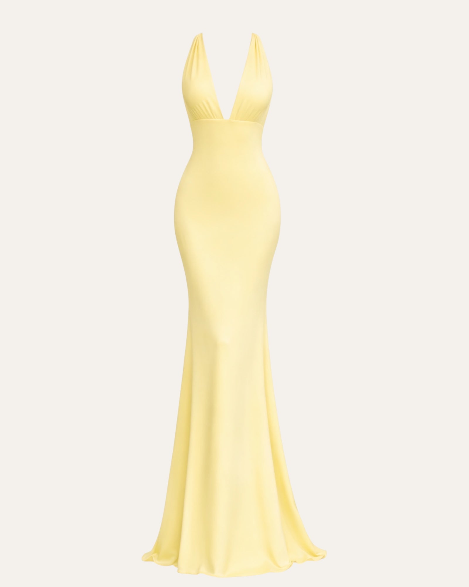 Guli halter maxi kjóllinn   Glæsilegur og tímalaus maxi kjóll í fallegum smjörgulum lit. Djúpt V-hálsmál og saumur undir brjóstum móta fallega línu á efri hluta kjólsins á meðan sniðið ... Sjá nánar