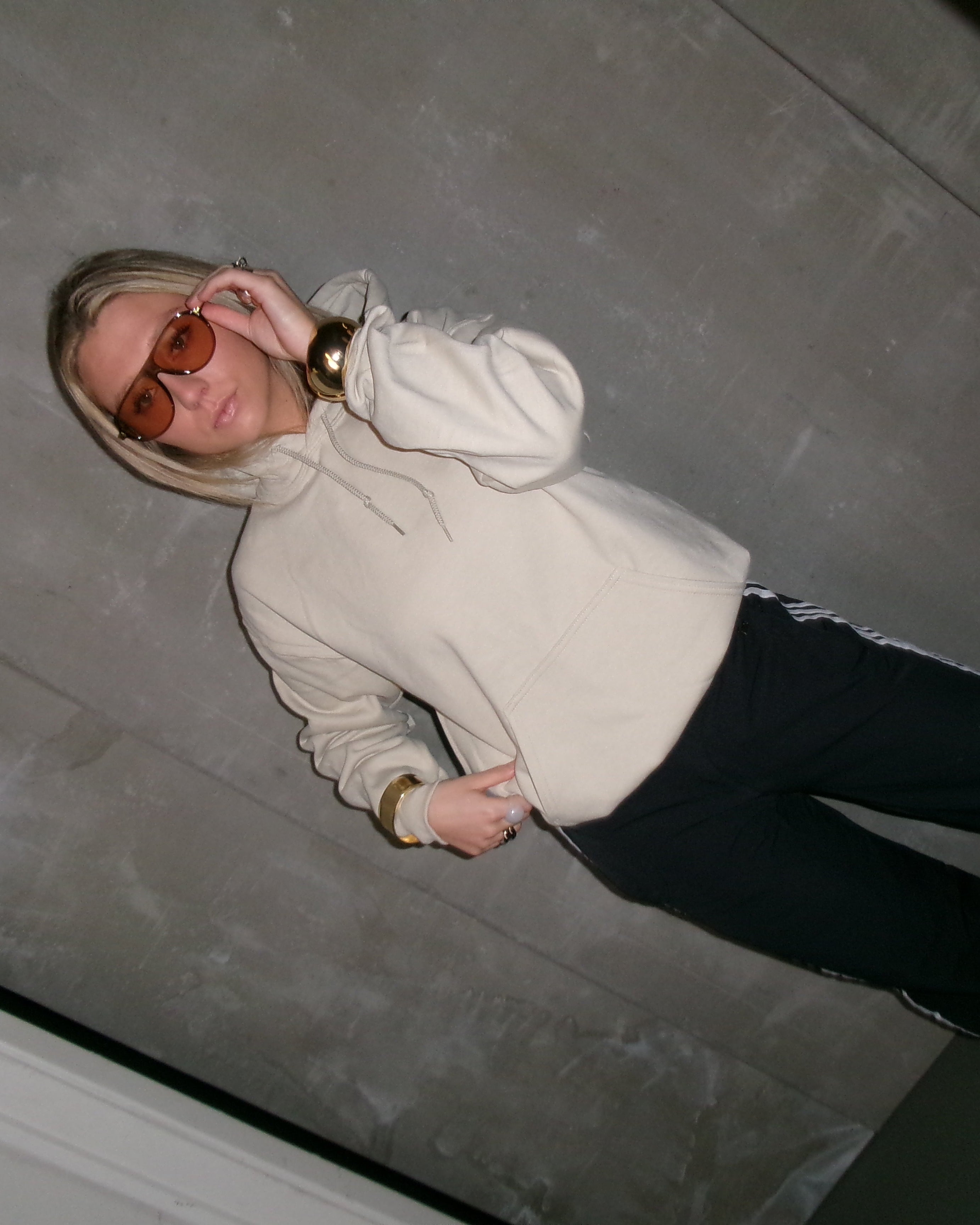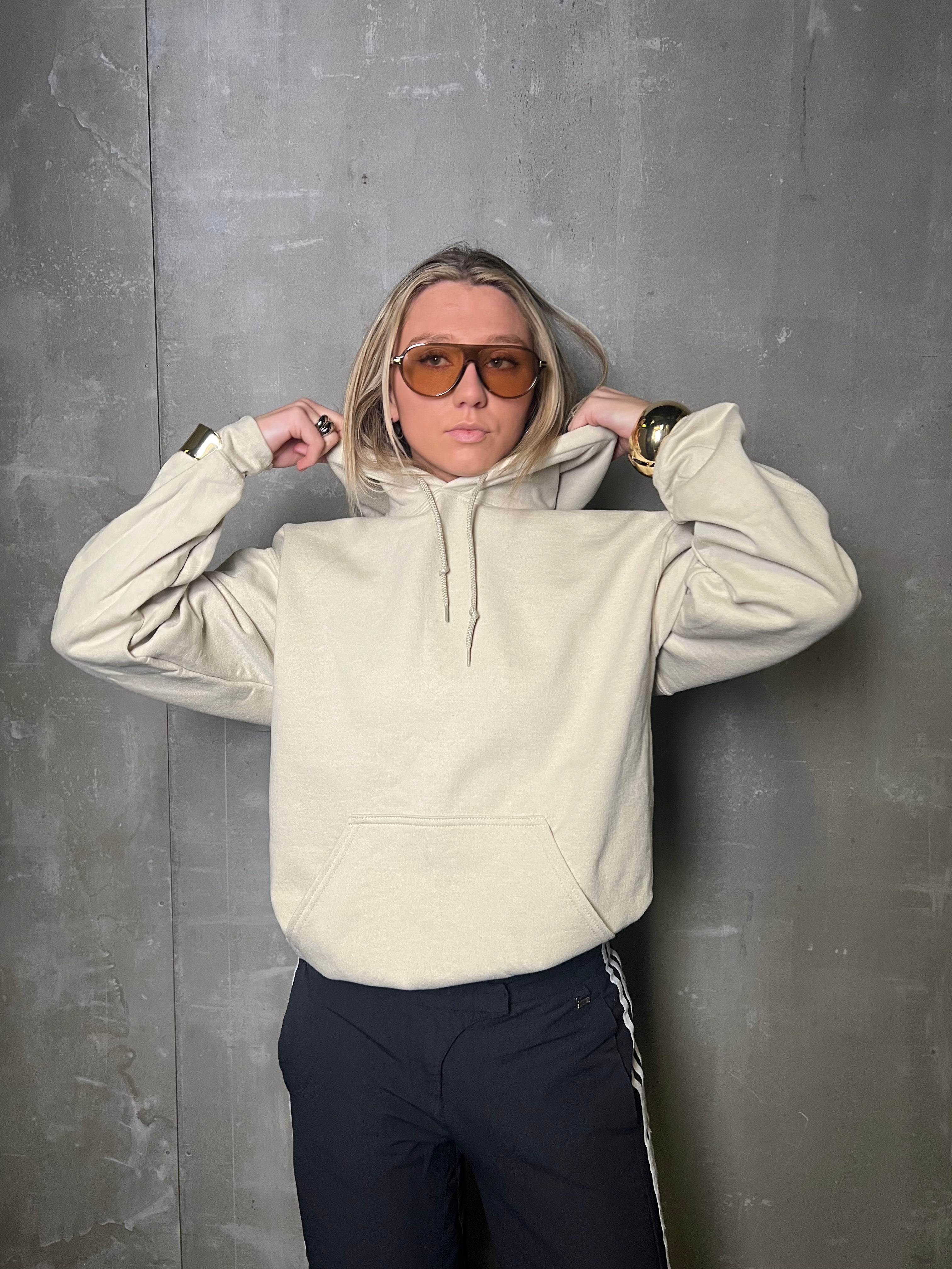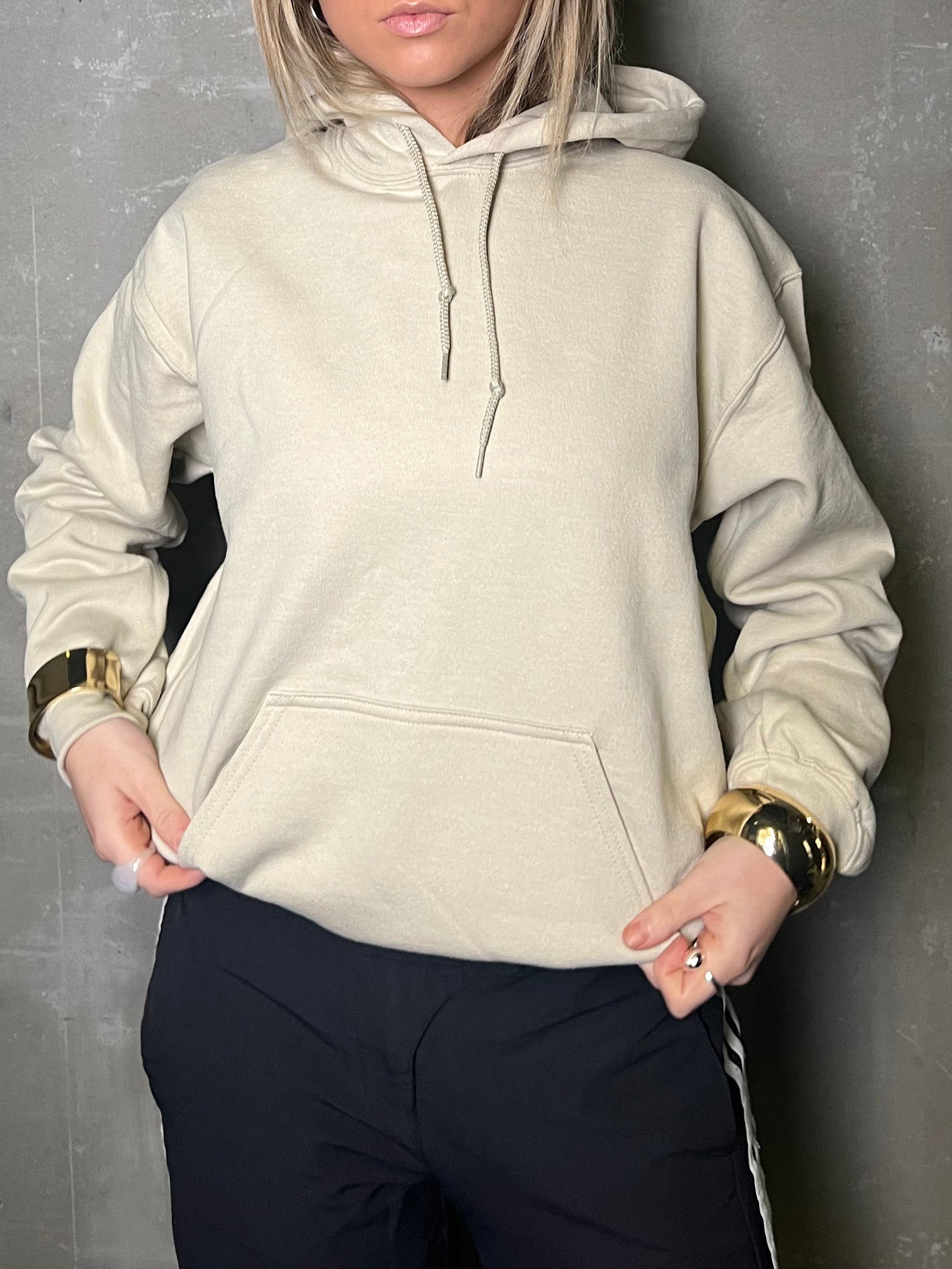 Sand hettupeysa  Módel er 170 cm á hæð og er í stærð M