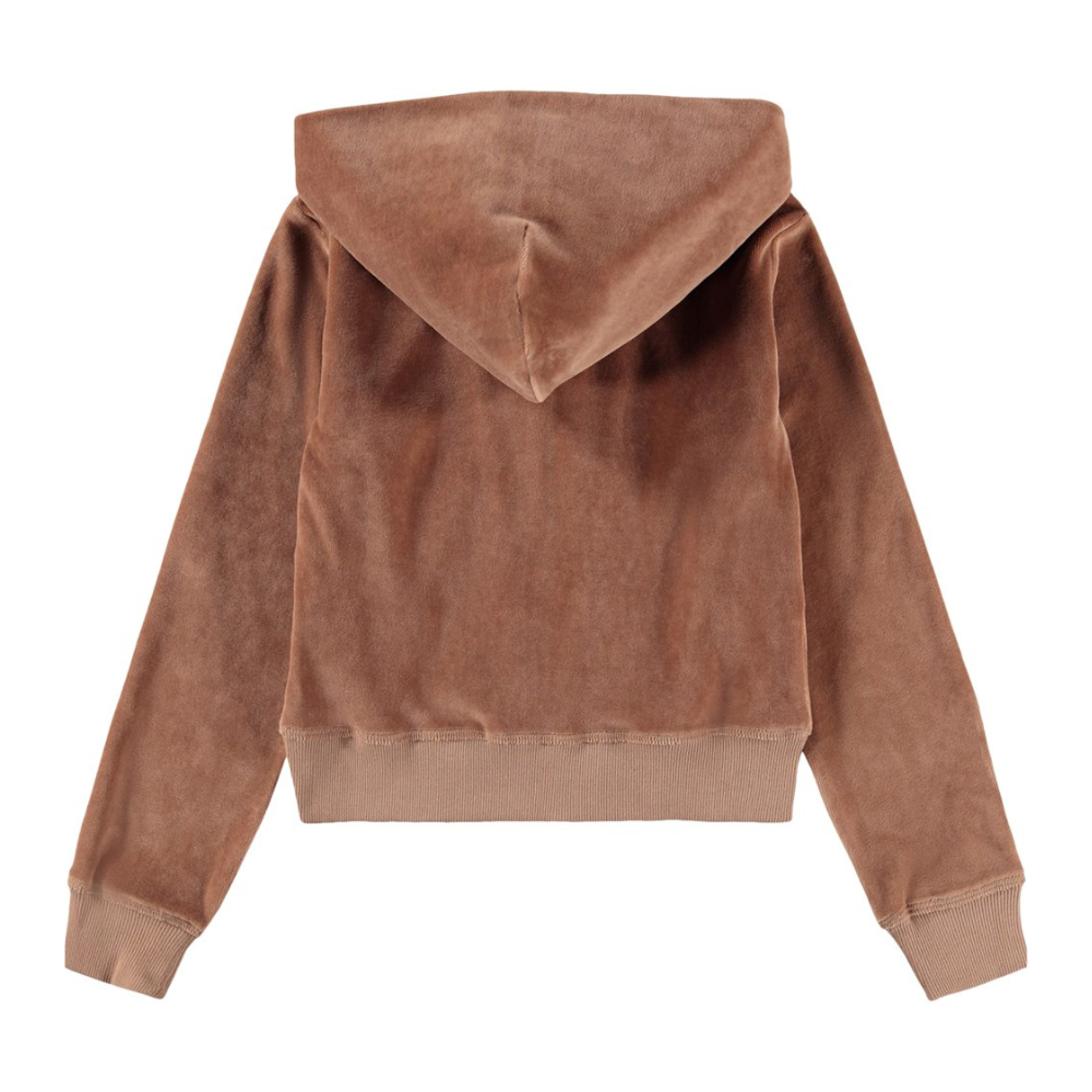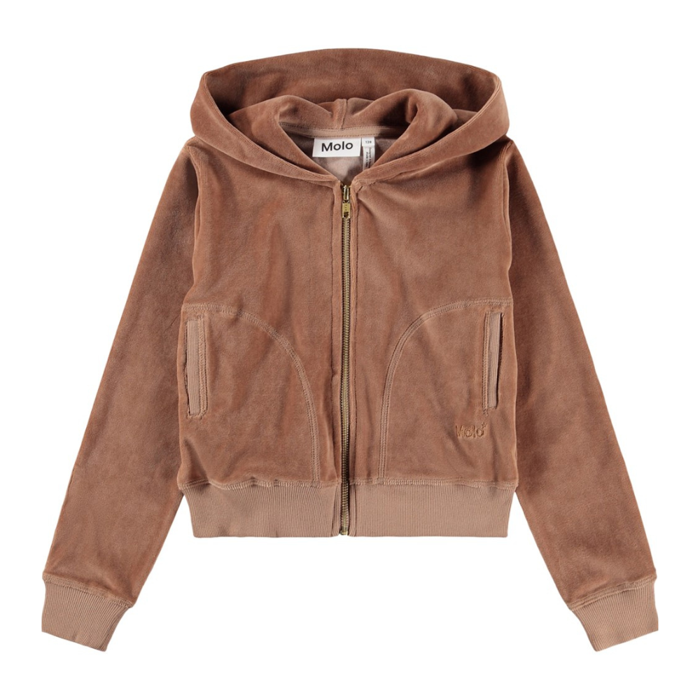 Mjúk, rennd velour peysa með hettu frá Molo. 80% bómull og 20% polyester.