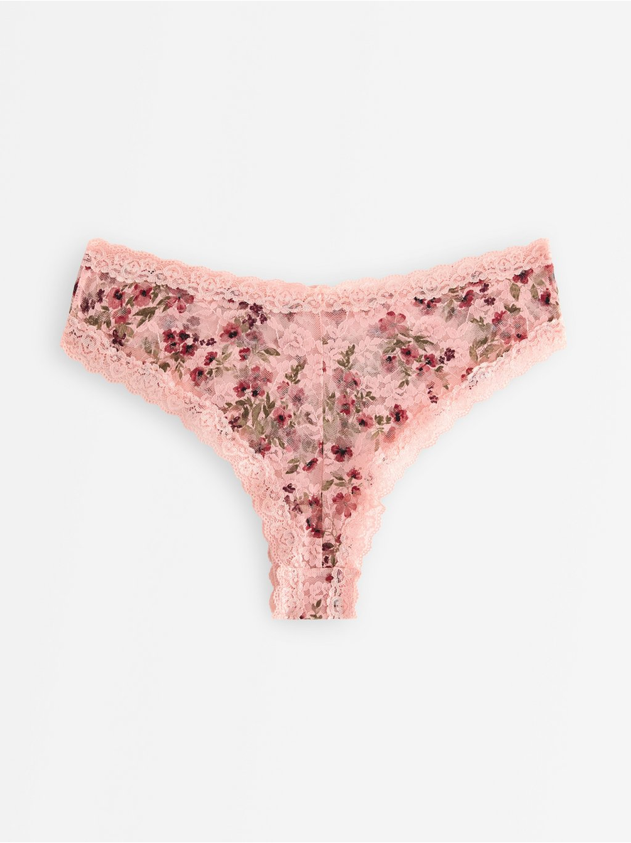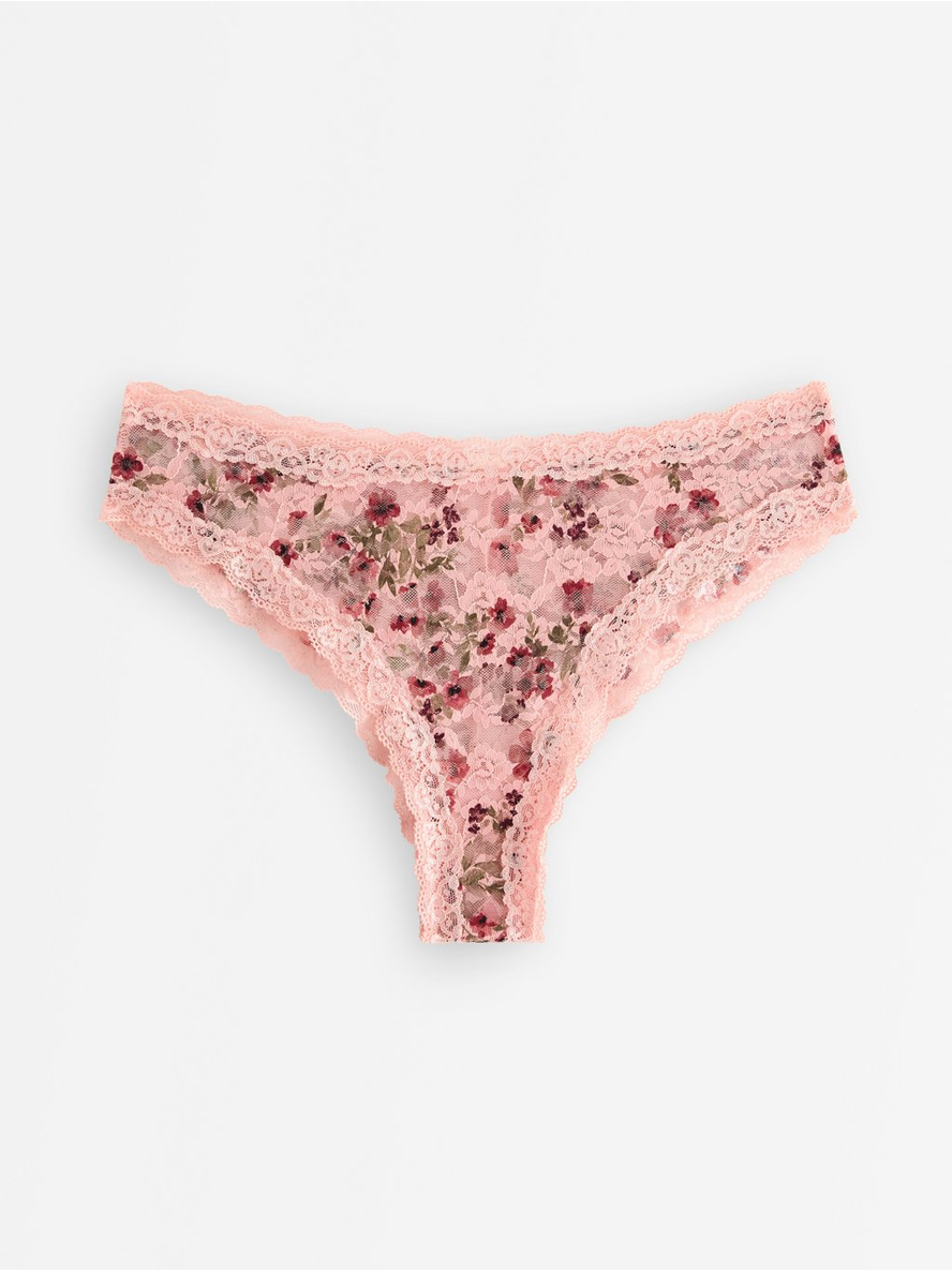 Brazilian briefs in lace with flowerprint. Lined crotch Midi waist Contains 51% recycled polyamide 87% pólýamíð 13% elastan