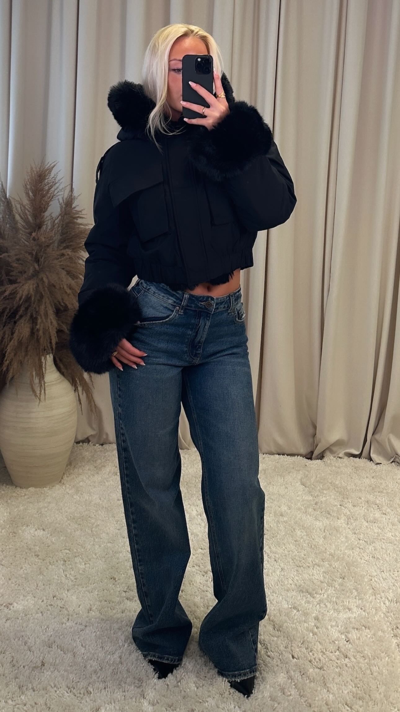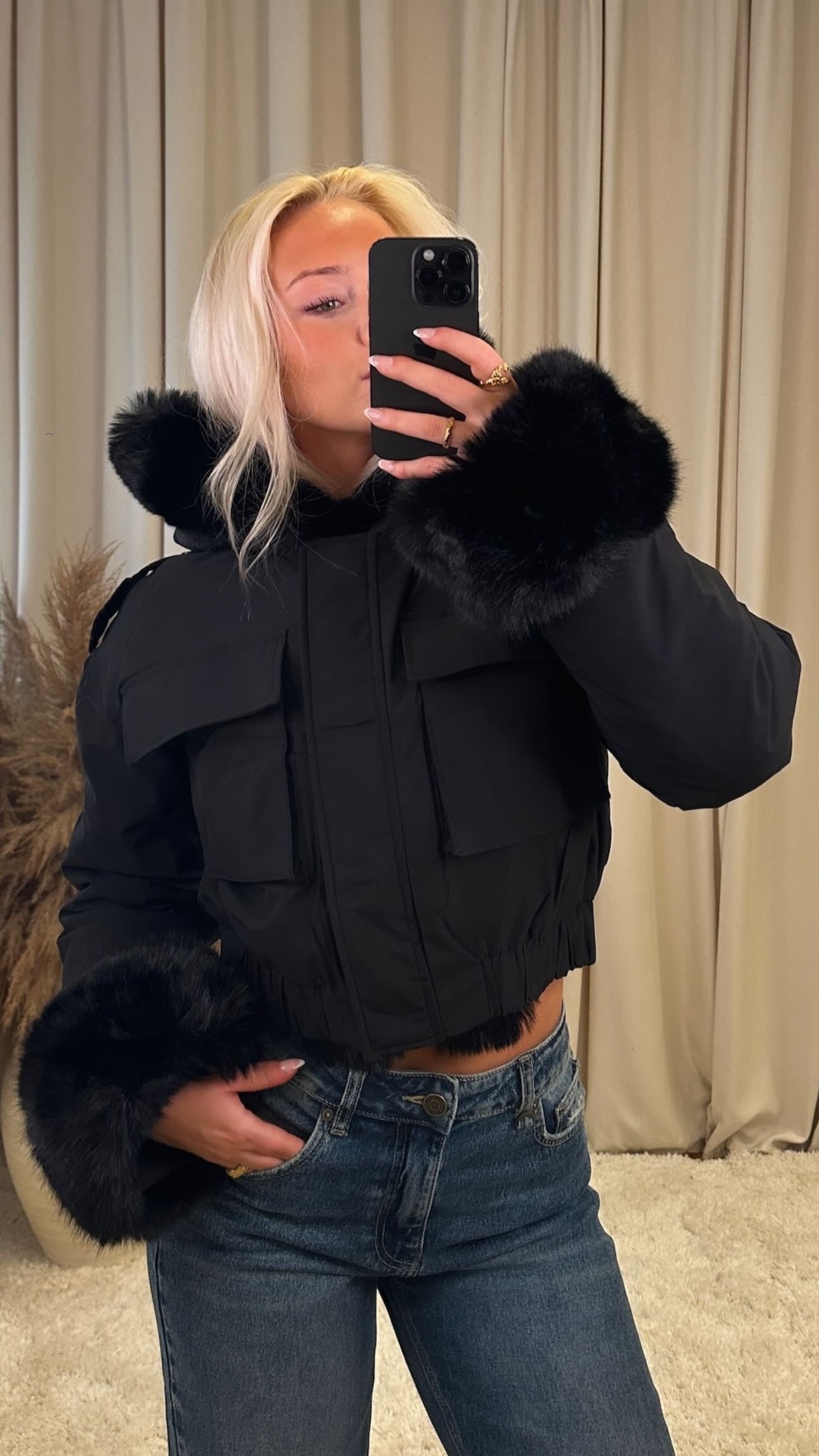 Stutt úlpa með hettu. Loð er á hettunni og ermunum sem hægt að að taka af. Model er 160cm á hæð í stærð Small.