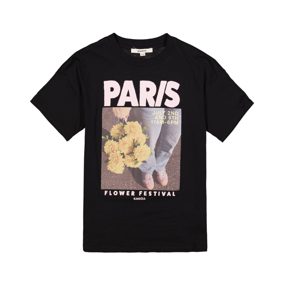 Svartur stuttermabolur frá Garcia með sórri mynd að framan. 95% bómull og 5% elastane.
