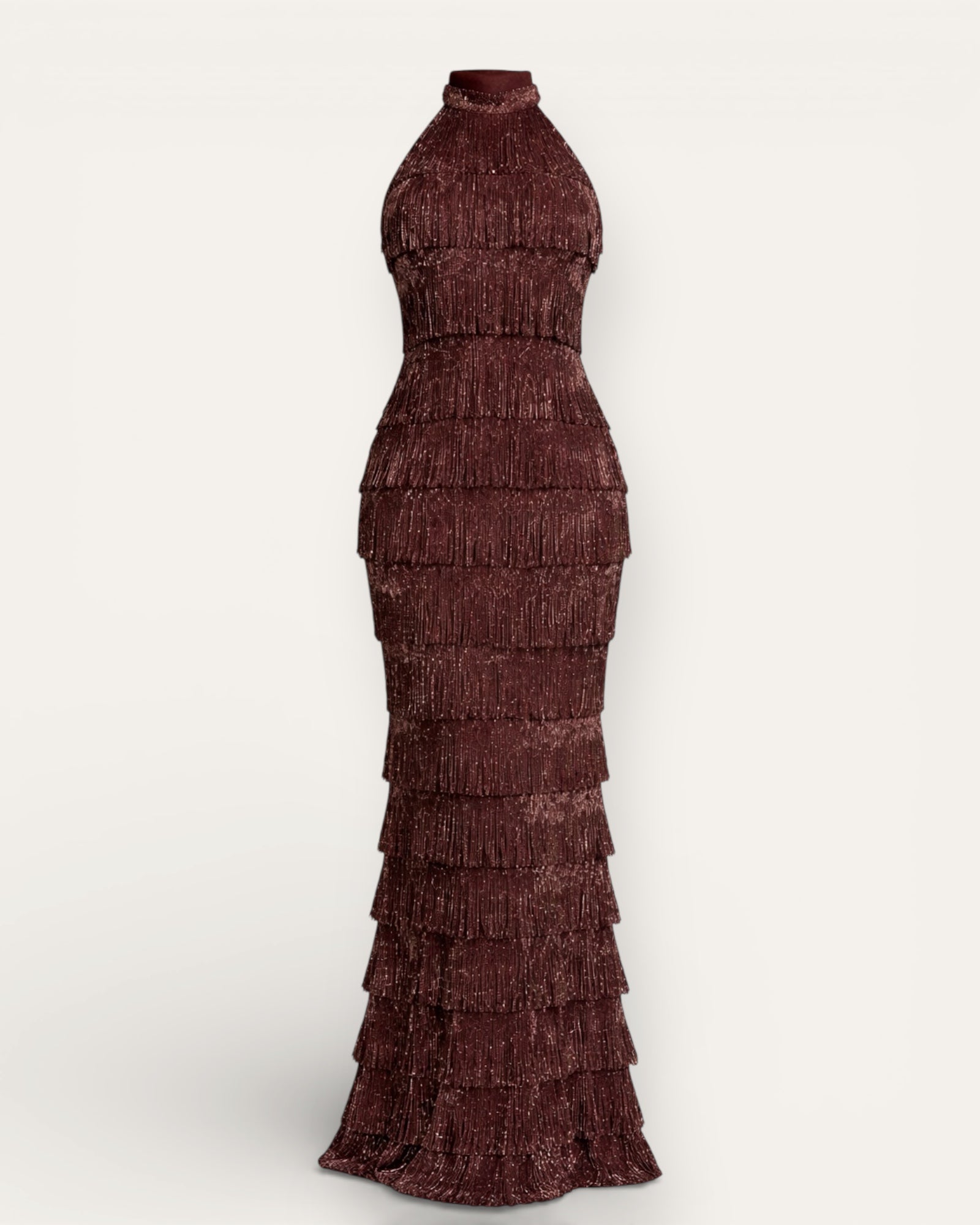 Glæsilegur maxi kjóll með fallegum fringes-lögum sem hreyfast ótrúlega fallega með hverju skrefi. Kjóllinn er með háu hálsmáli að framan og opnu baki með krossuðum böndum sem gefa honum ... Sjá nánar