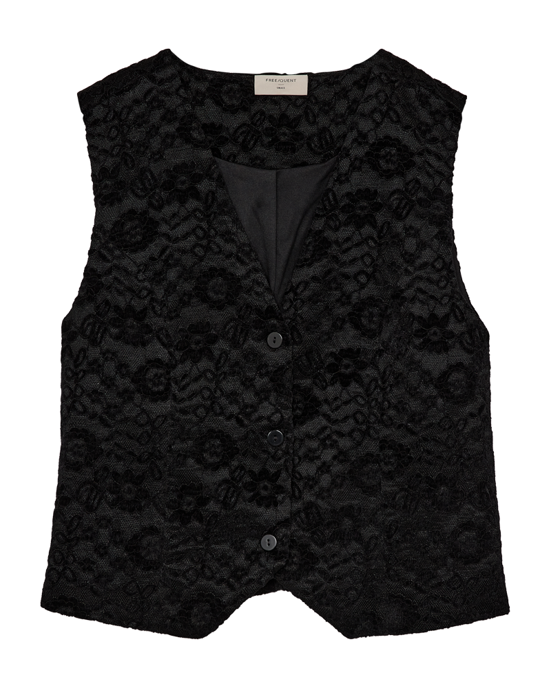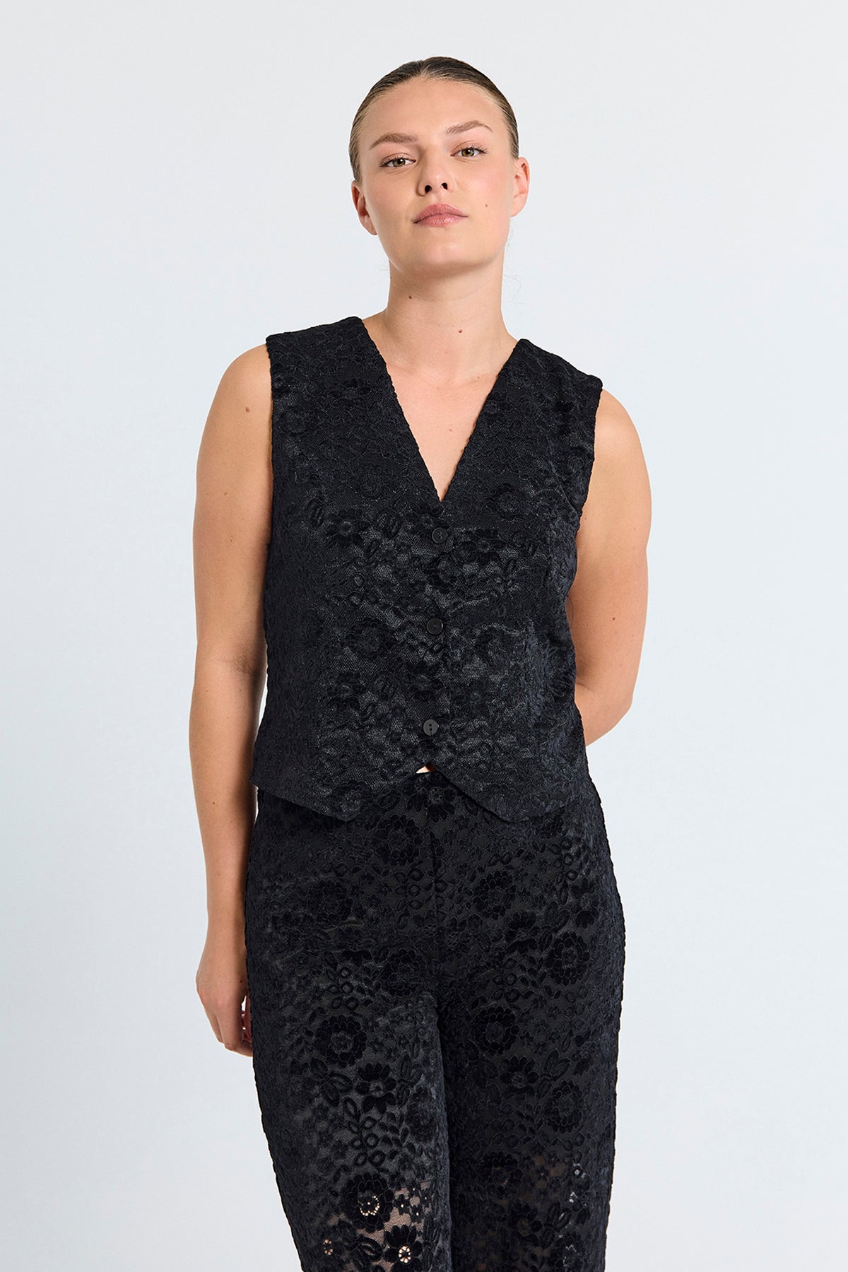 Ótrúlega fallegt og sparilegt vesti með velúr blómum á frá Free/Quent. 90%polymide 10%teygja