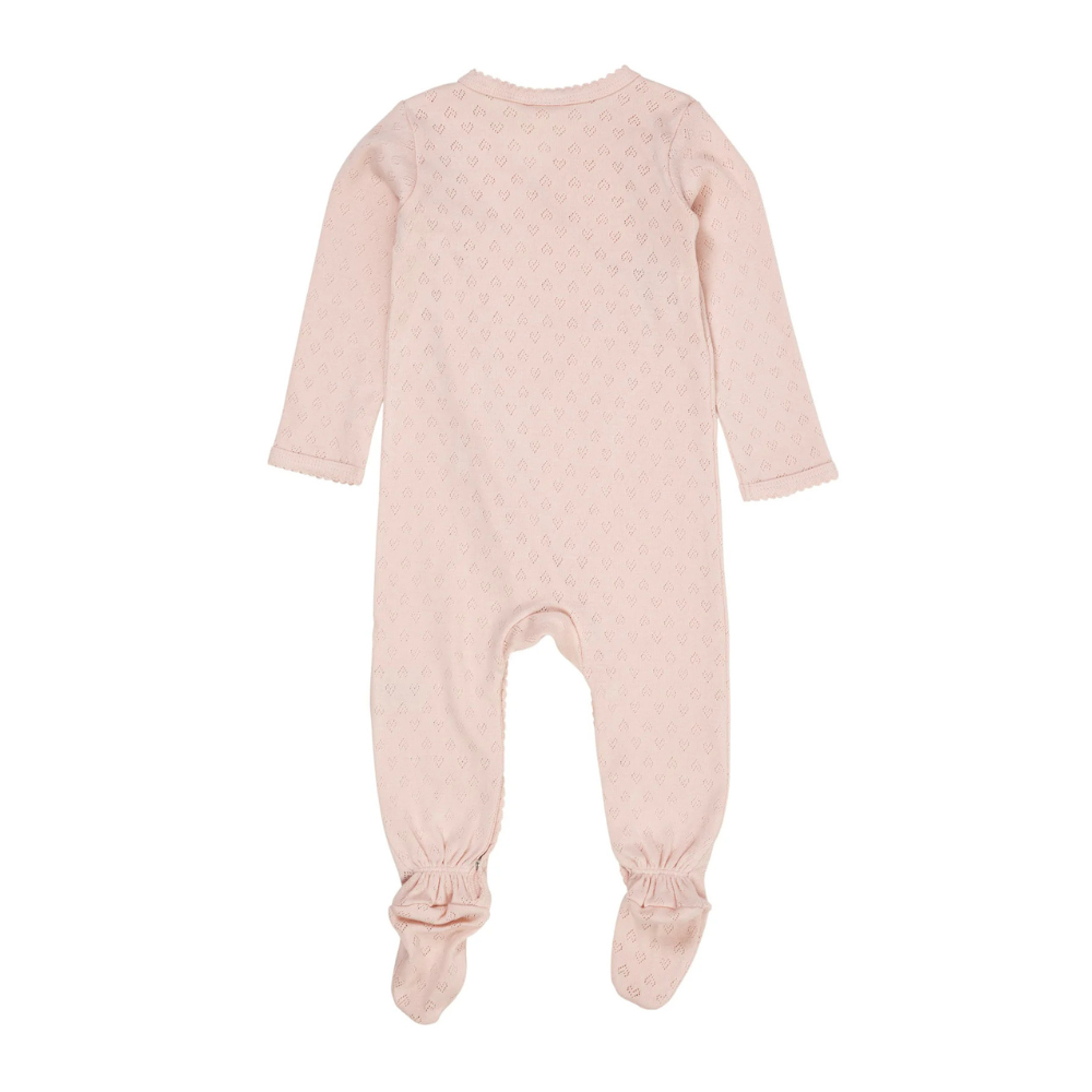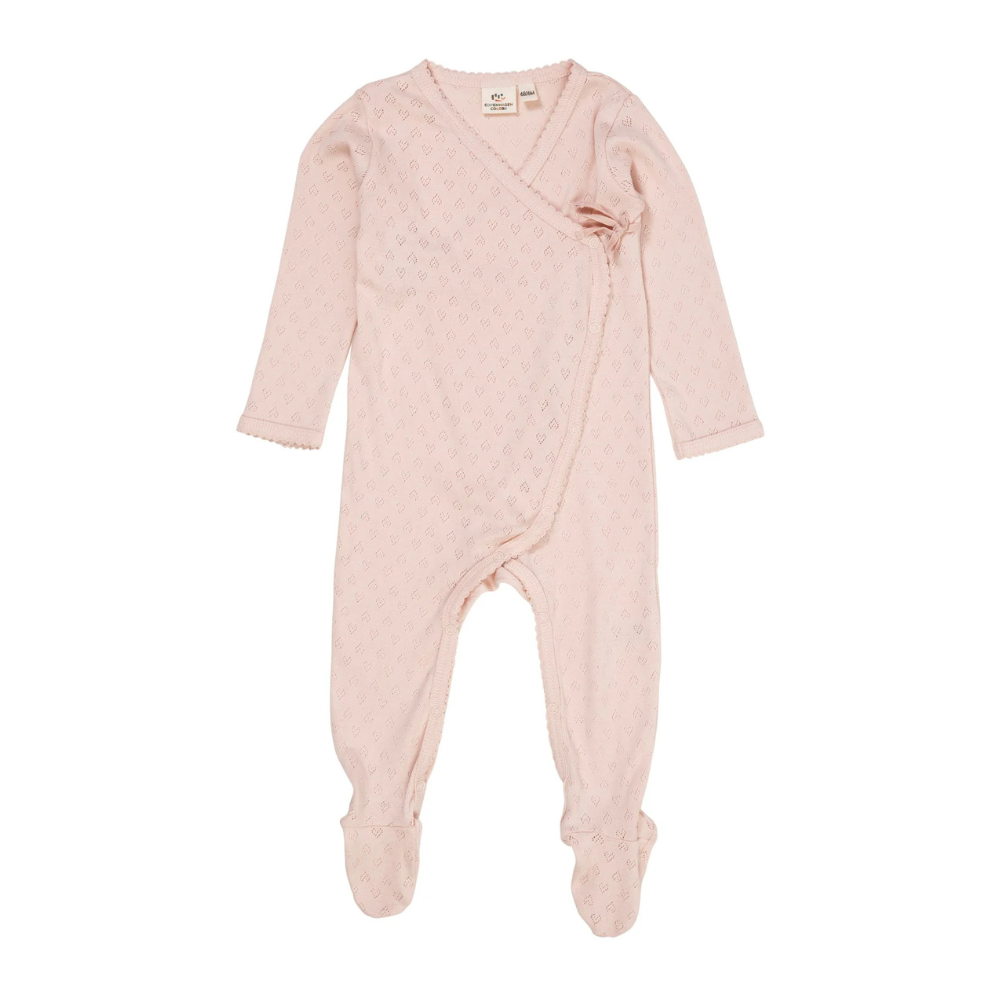 Ljós bleikur heilgalli frá Copenhagen Colors með smáu gatamynstri og áföstum sokkum . Gallinn er bæði smelltur og bundinn að framan. 100% bómull.