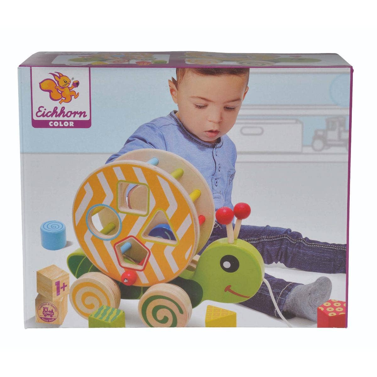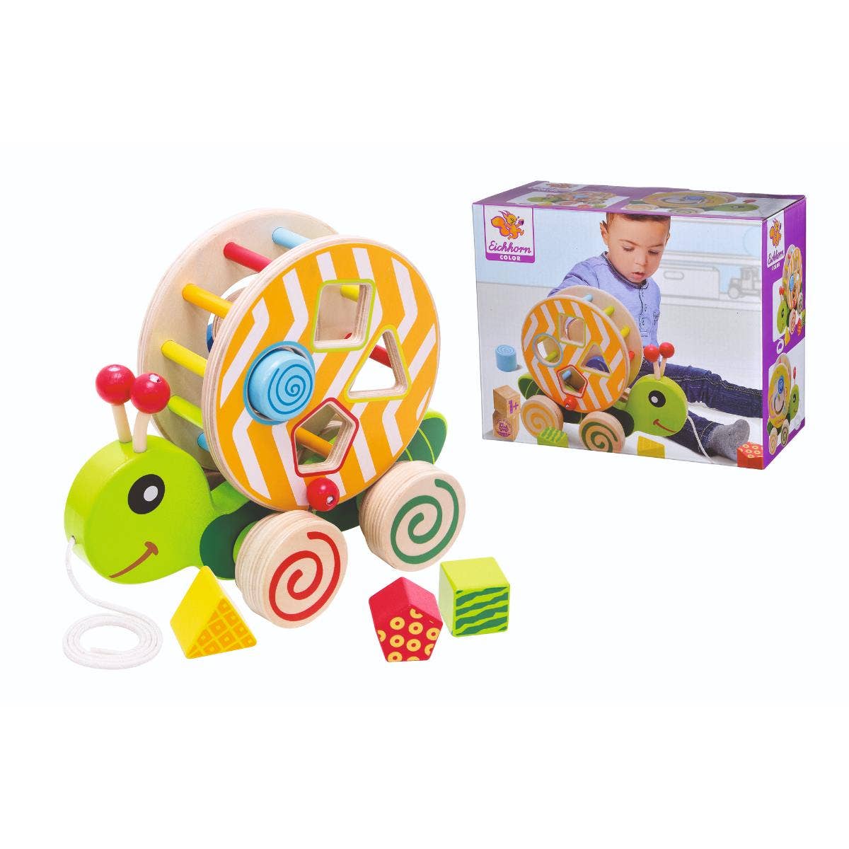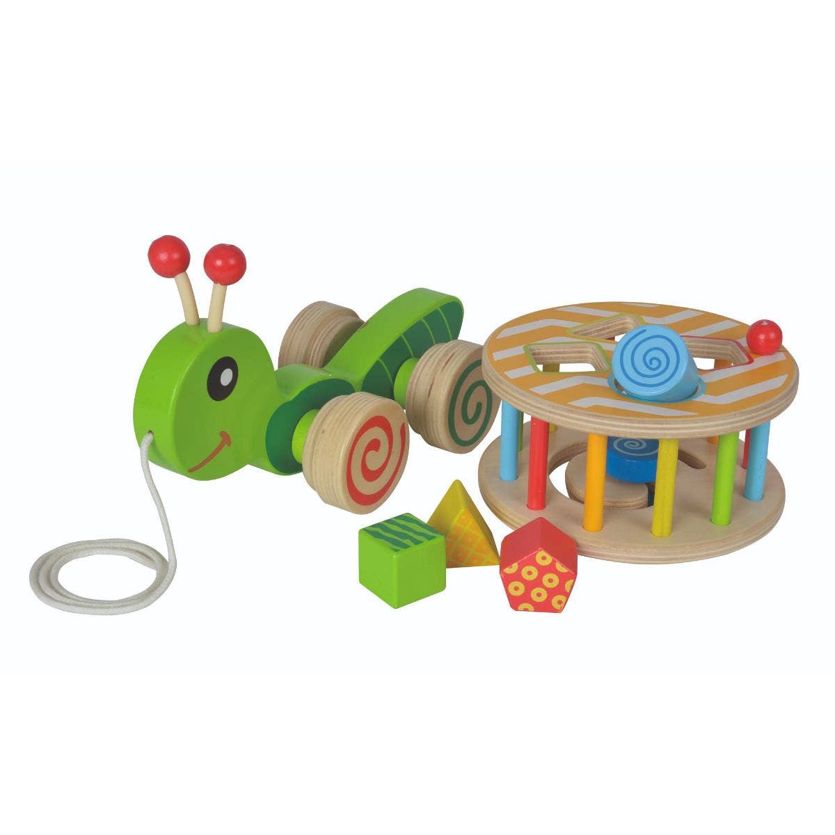 Viðarsnigill á hjólum með 2 þroskaleikföngum.