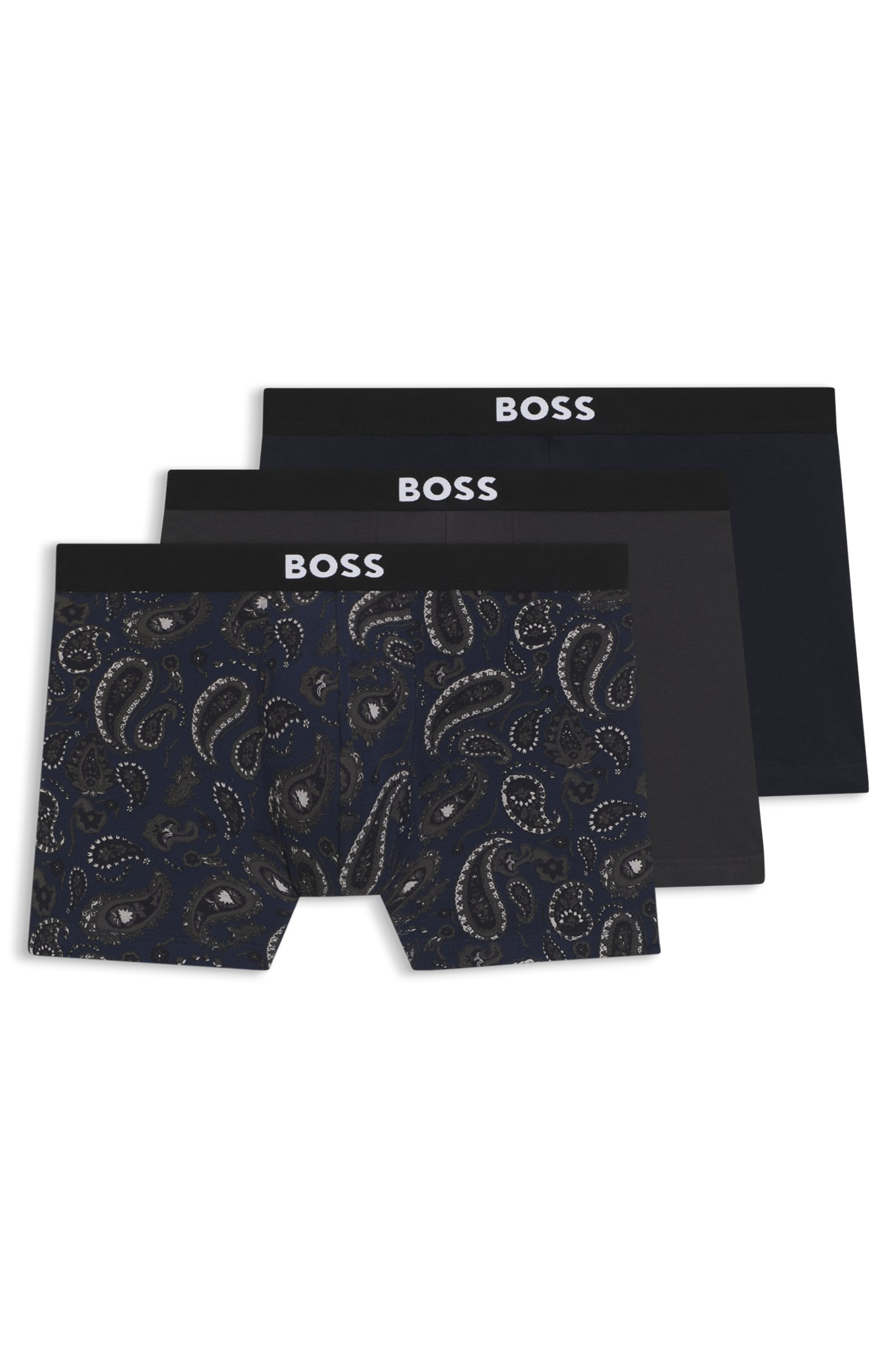 Offering plain and printed designs, this three-pack of BOSS Menswear boxer briefs is ideal for everyday wear. Logo waistbands. Soft stretch-cotton jersey. Packaging: Box Exposed waistband ... Sjá nánar