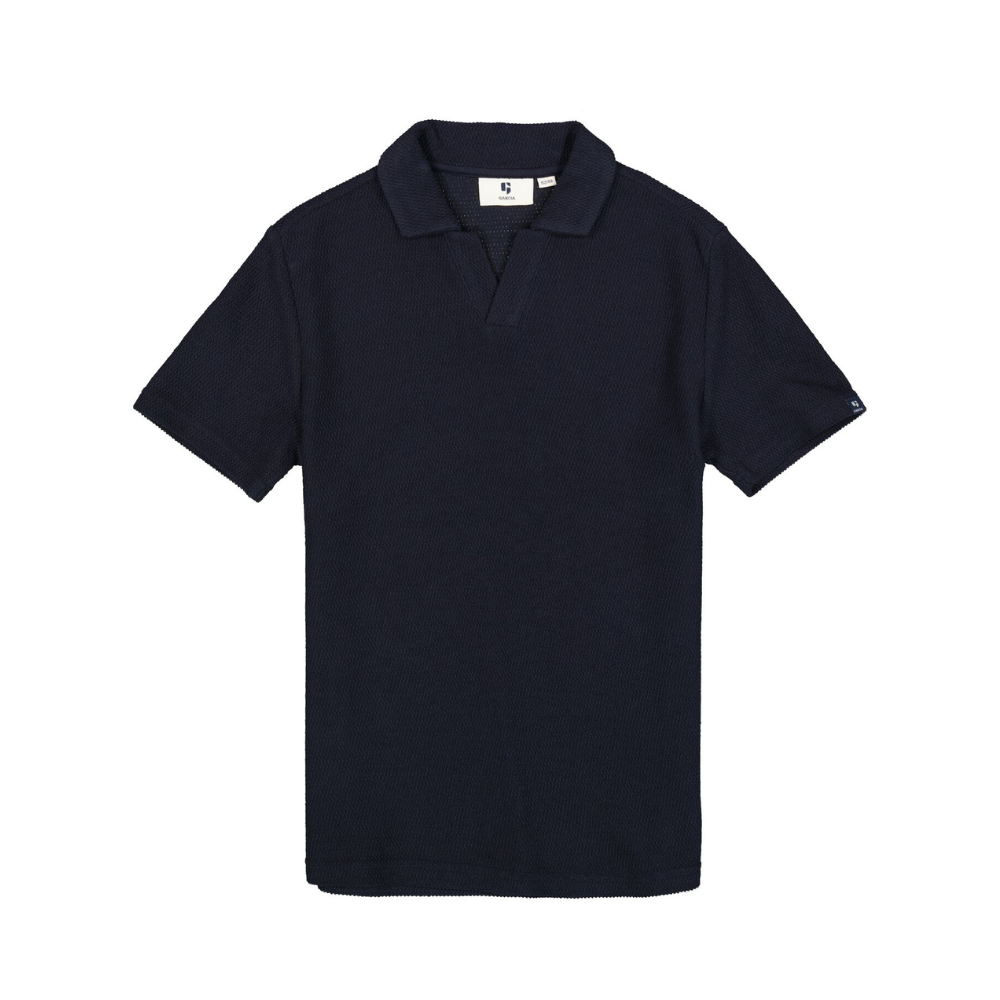 Dökk blár stuttermabolur með kraga. 83% bómull og 17% polyester.