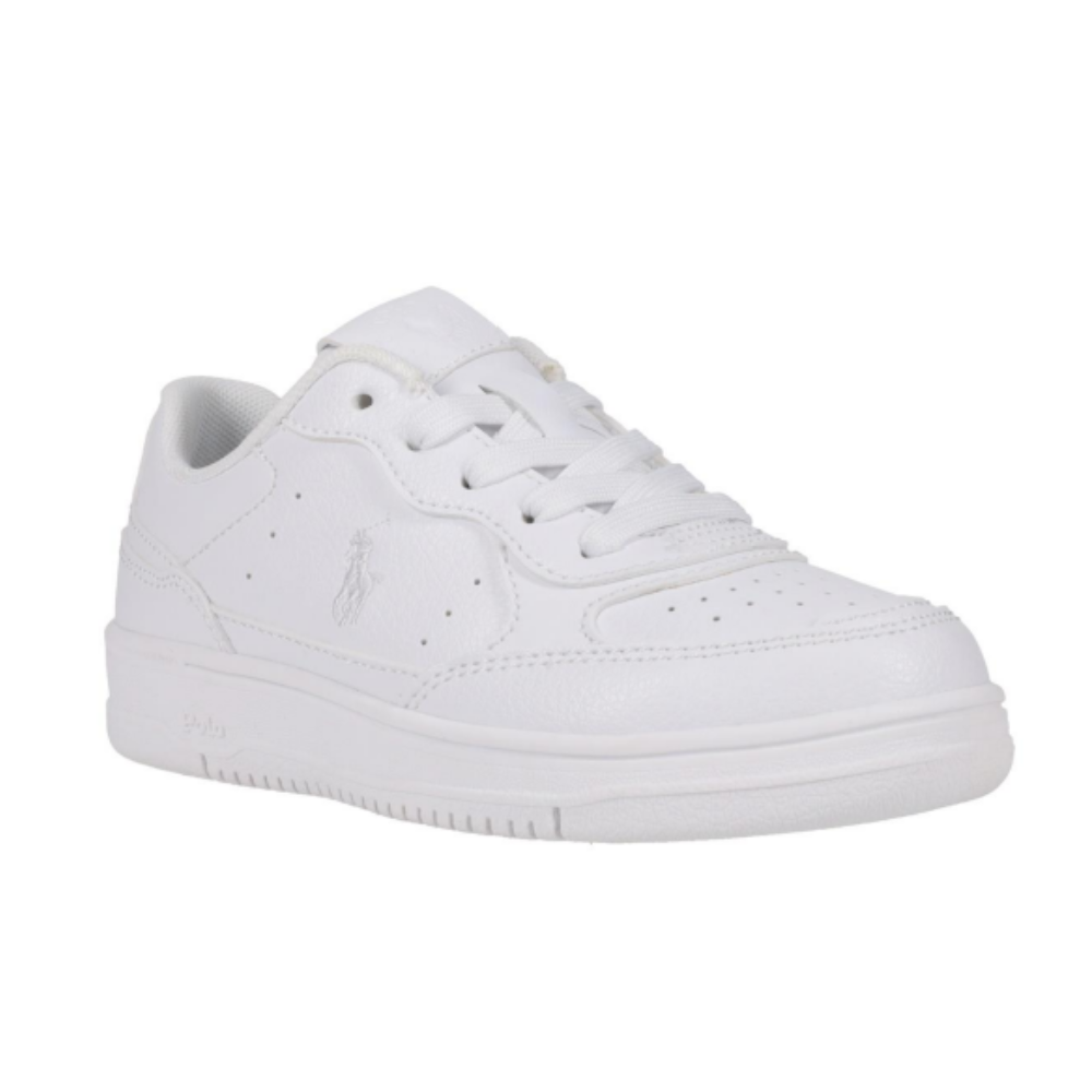 Hvítir strigaskór frá Polo Ralph Lauren með útsaumuðu logo á hliðum og á tungu. Skórnir eru með reimum.