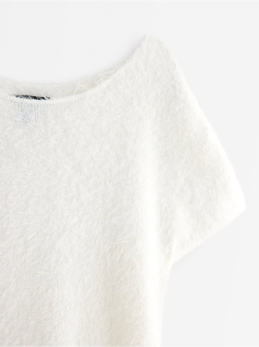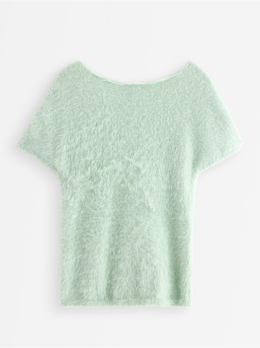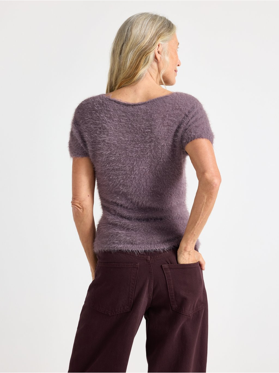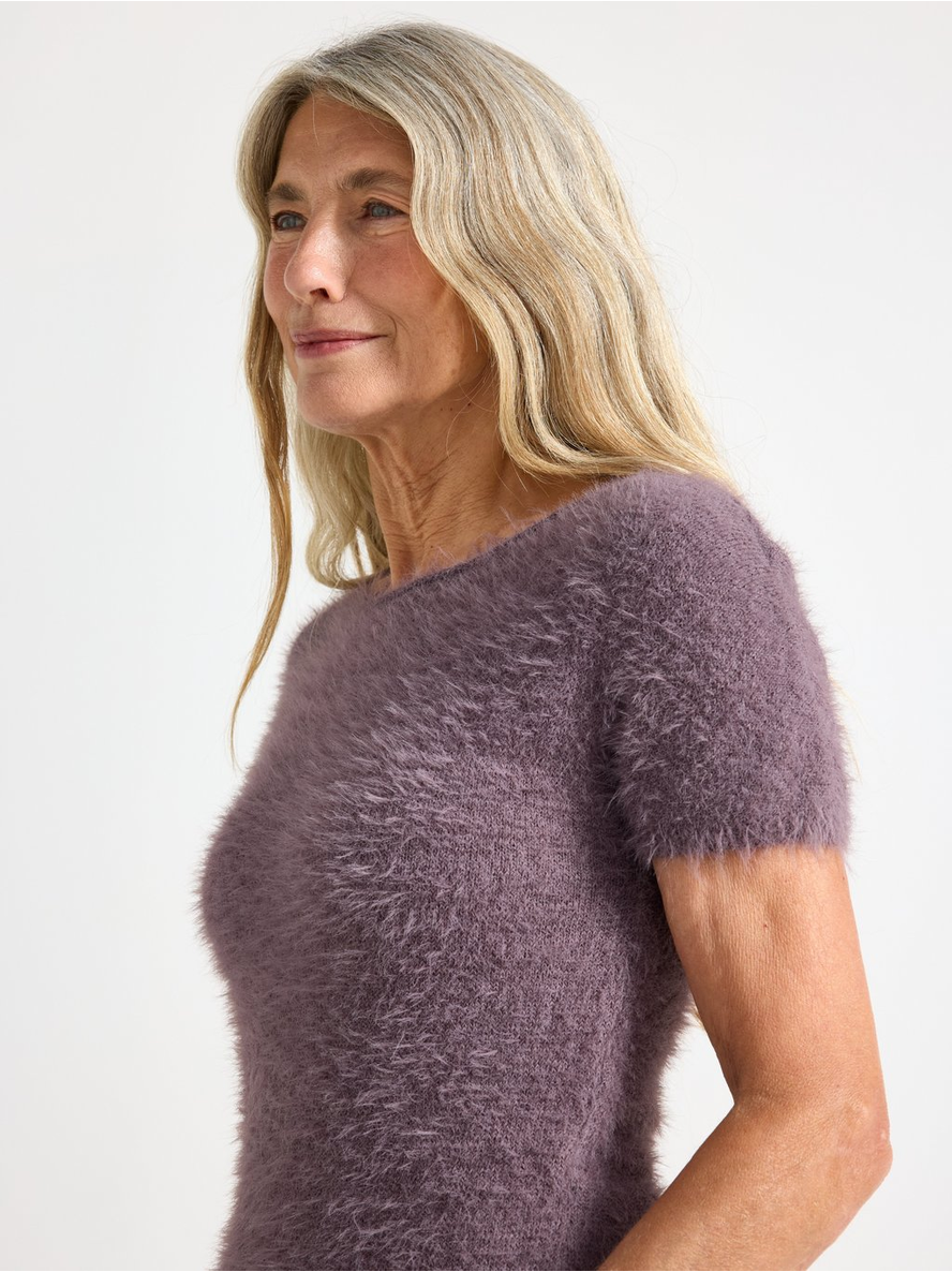 Knitted top in soft feather yarn with fitted waist and short sleeves. Short sleeves Length 54 cm in size M 100% pólýamíð