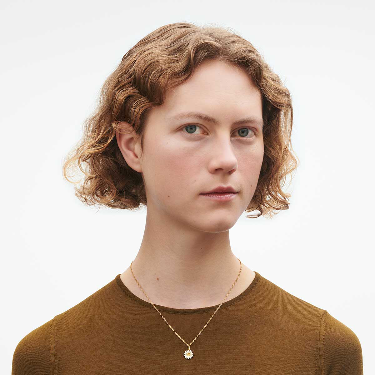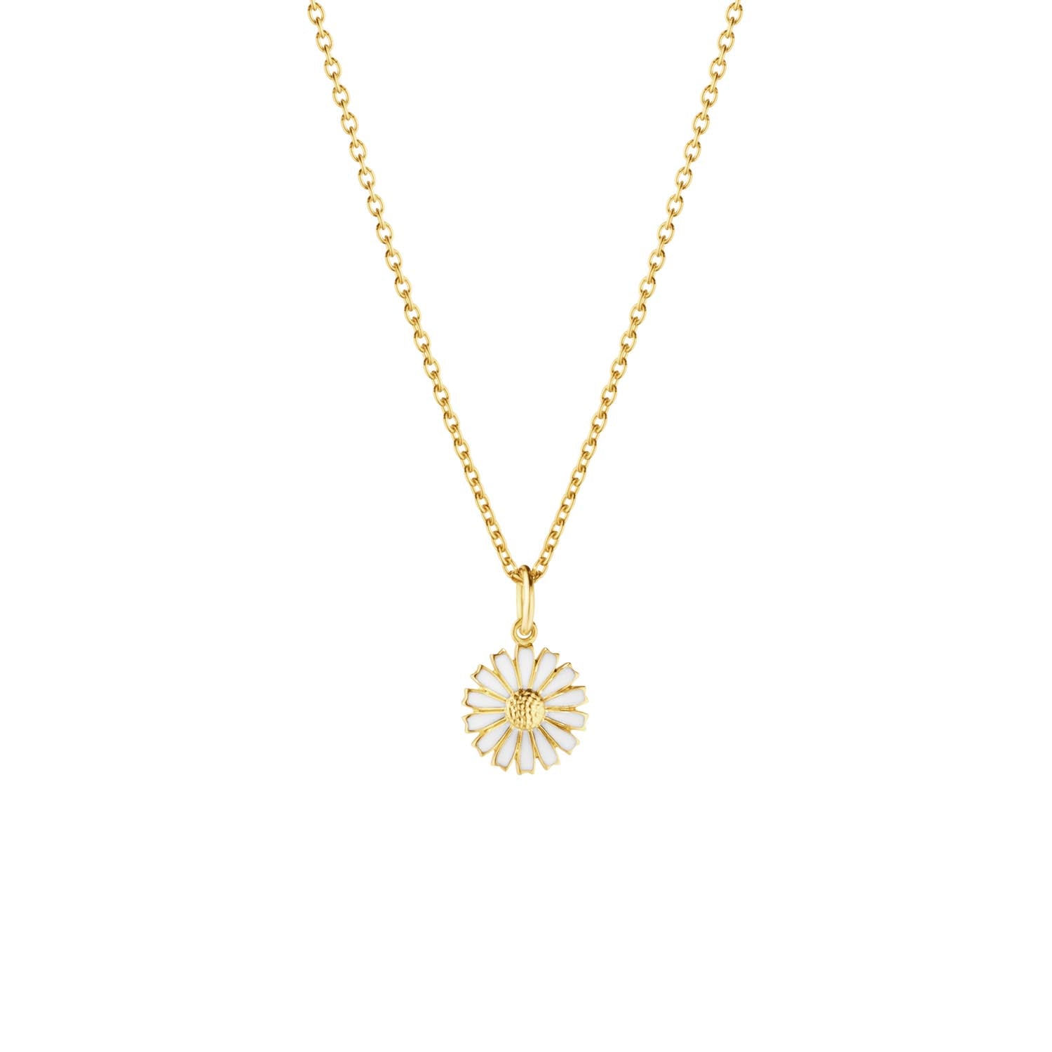 Hálsmenið er frá skartgripalínu Georg Jensen sem kallast Daisy. Menið er úr silfri með 18 karata gullhúð og hvítri emileringu. Þvermál blómsins er 11 mm.  Lengd festarinnar er stillanleg frá ... Sjá nánar