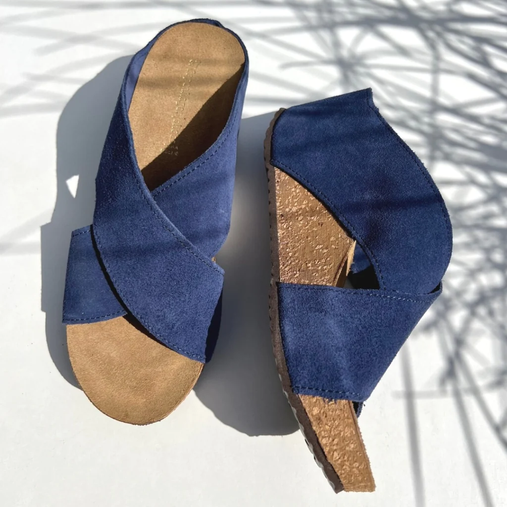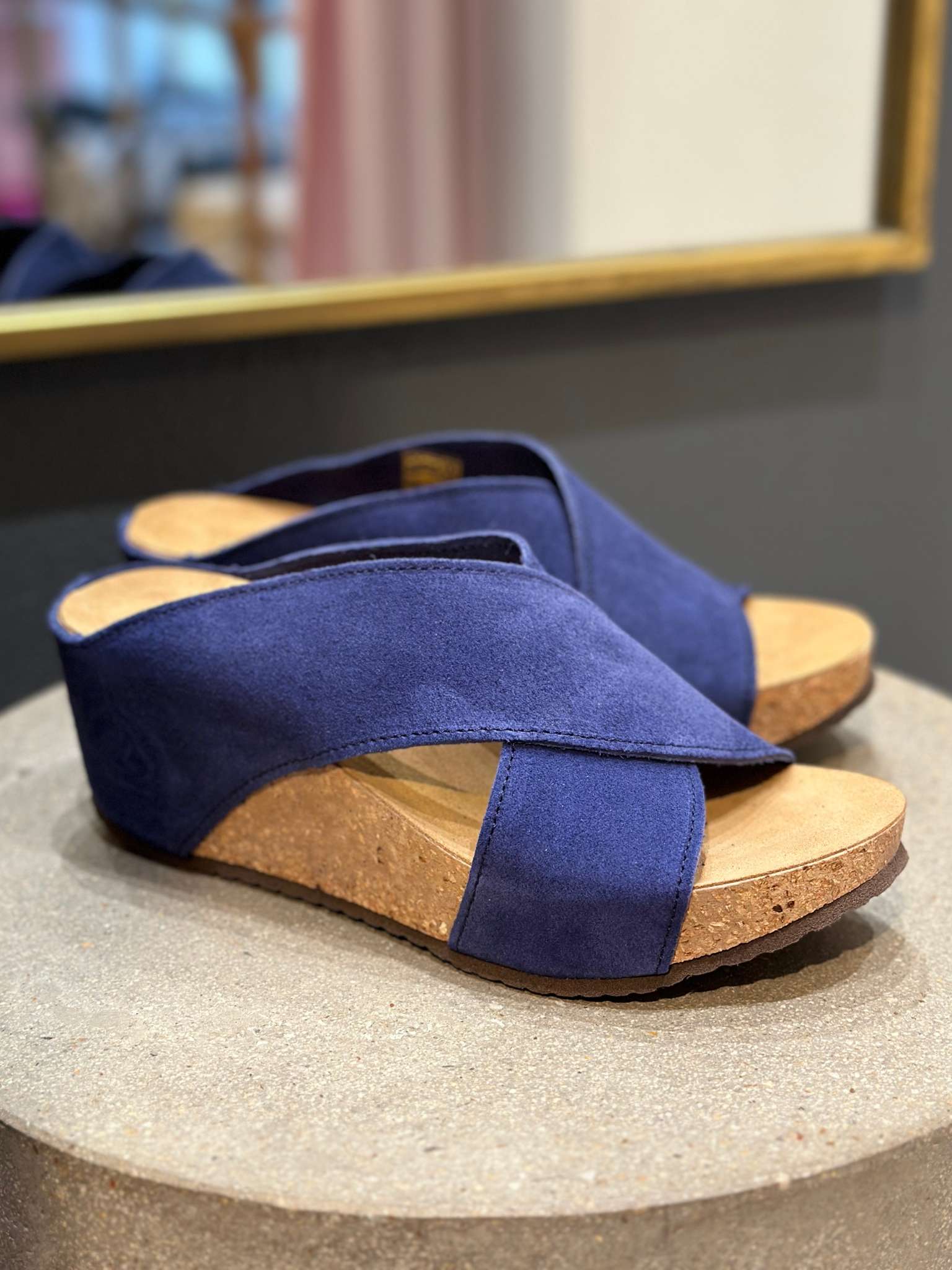 – Dökkblátt – Ekta leður – Mjúkt leðurinnlegg – Gúmmísóli – Venjulegar stærðir – Hæll 6 cm Æðislegir wedge sandalar með gúmmíklæddum korksóla. Fallegt dökkblátt rúskinn og krossband ... Sjá nánar