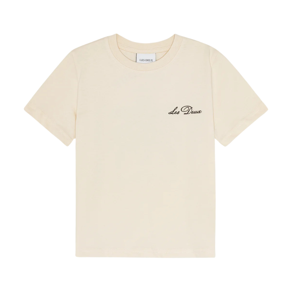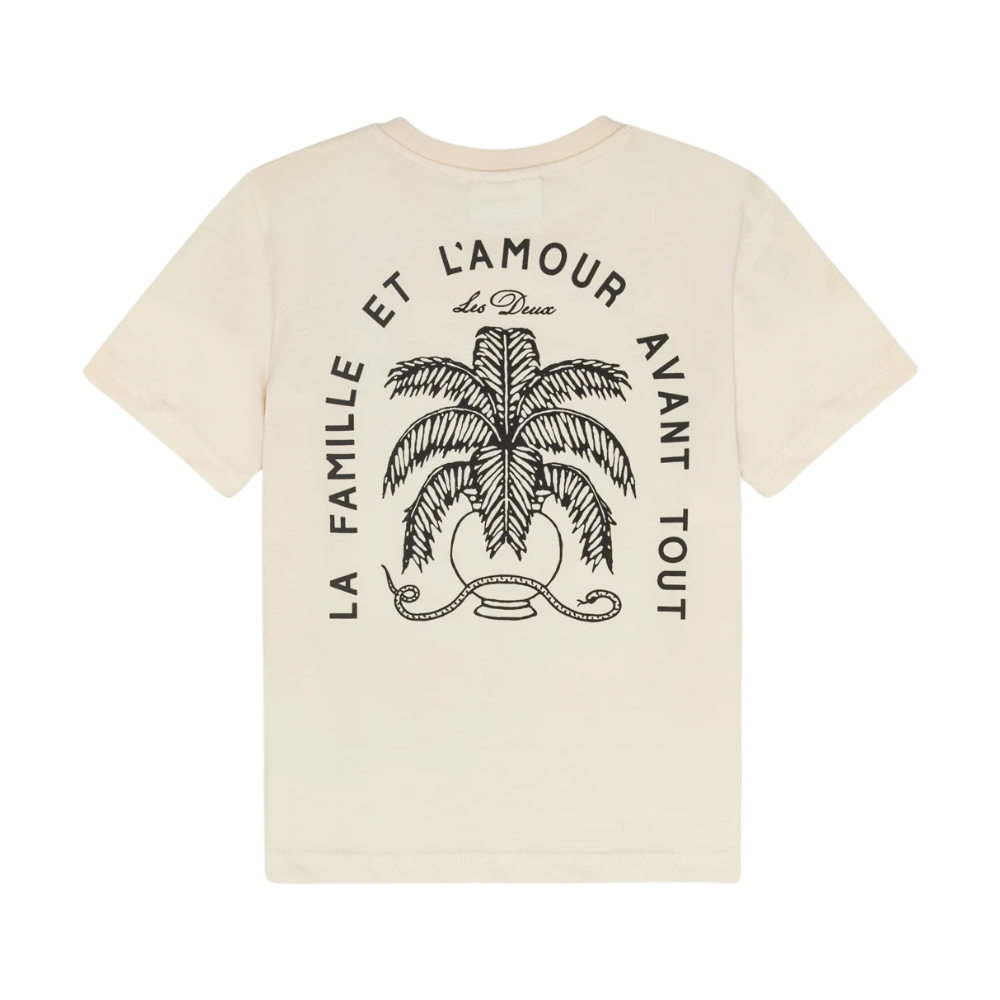 Ljós stuttermabolur frá Les Deux með litlu logo að framan og stórri mynd að aftan. 100% bómull.
