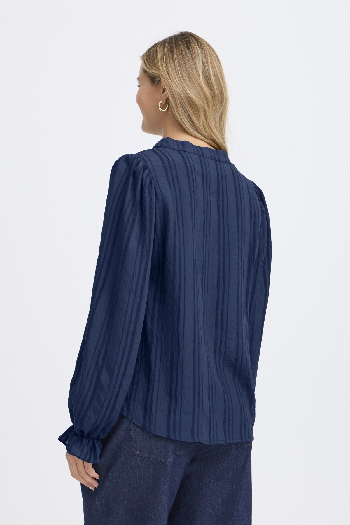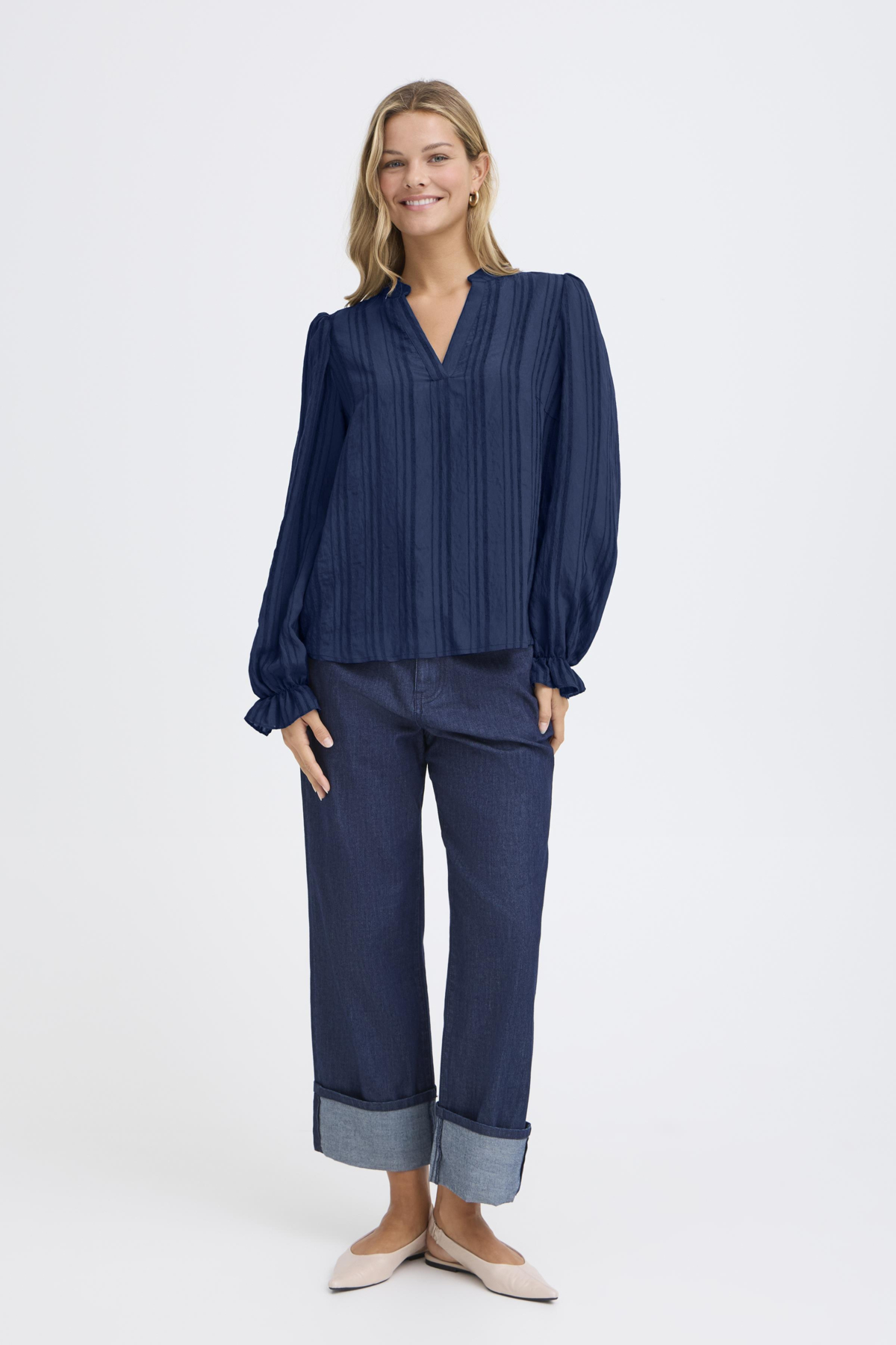 Falleg blússa frá FRANSA með v-hálsmáli og teygju fremst á ermum. Stærðirnar eru nokkuð hefðbundnar hjá FRANSA og er mælt með því að rétt stærð sé tekin, ekki minni eða stærri.