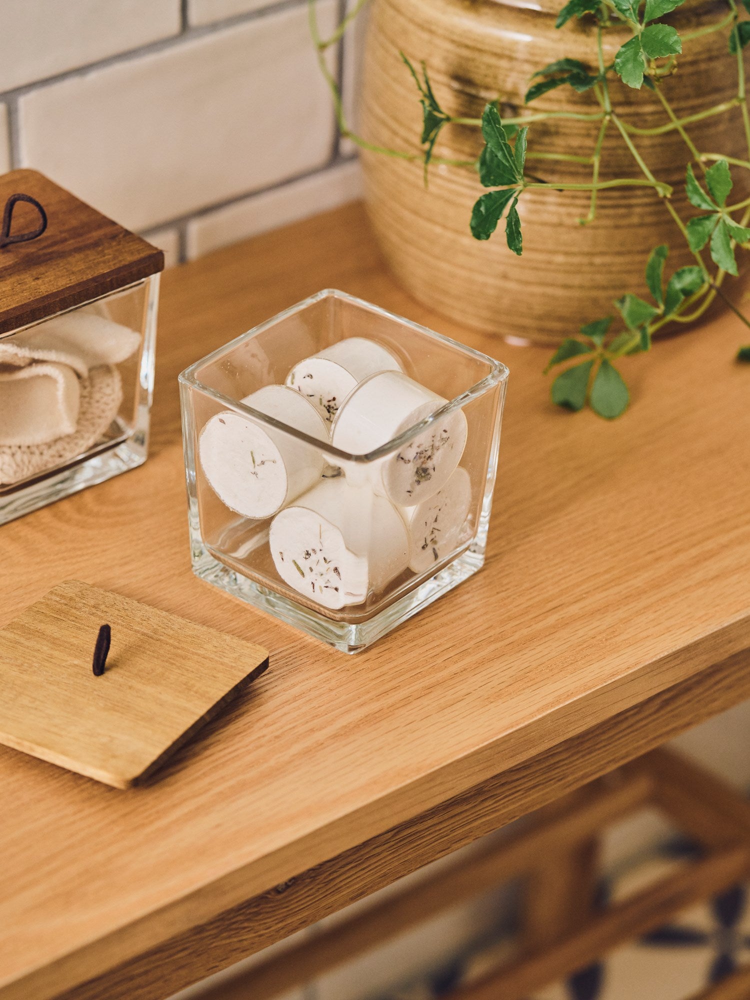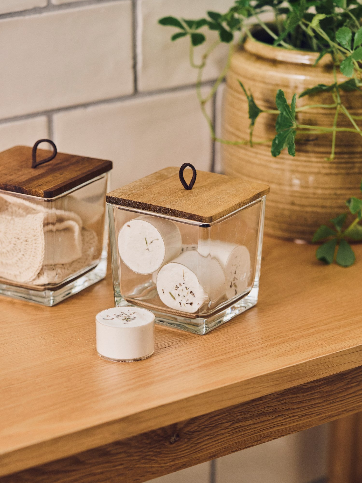 Timeless elegance "A charming glass jar with a wooden lid is a delightful addition to the bathroom," Clara notes. "It keeps essentials neatly stored," Anna adds, admiring its practical beauty.