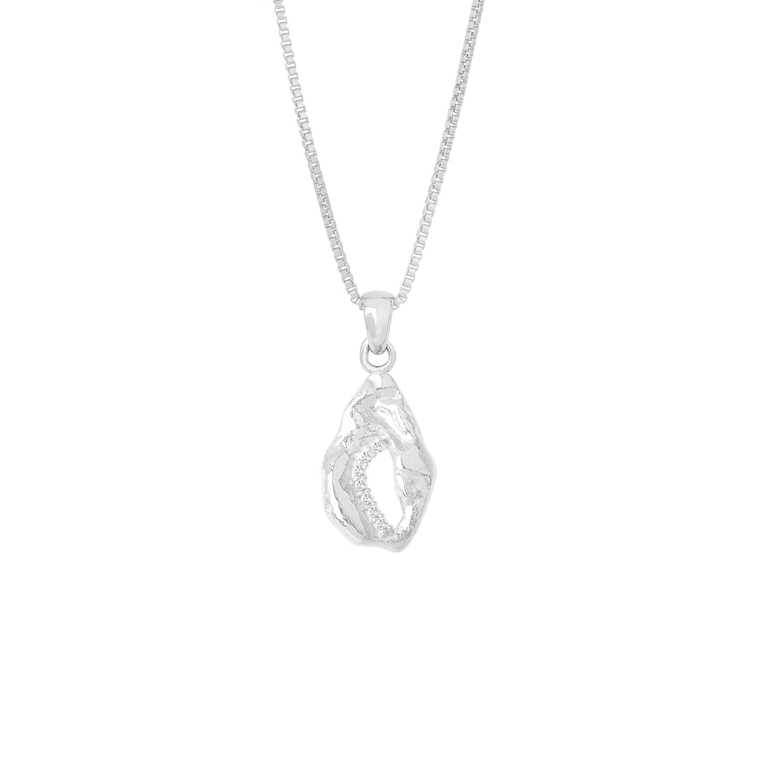 Hálsmenið er handsmíðað úr rhodiumhúðuðu silfri með cubic zirconia steinum. Hæð mensins er um 14 mm. Hönnuður og smiður er Berglind Snorra.