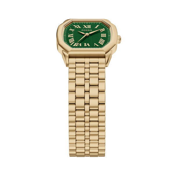 Innblásið af klassískum stíl. Fallegt úr úr gylltu, ryðfríu stáli með átthyrningskaga kassa, grænni skífu og þremur vísum.