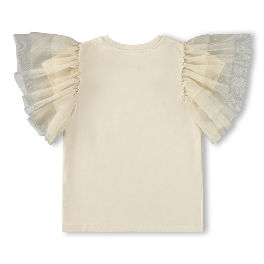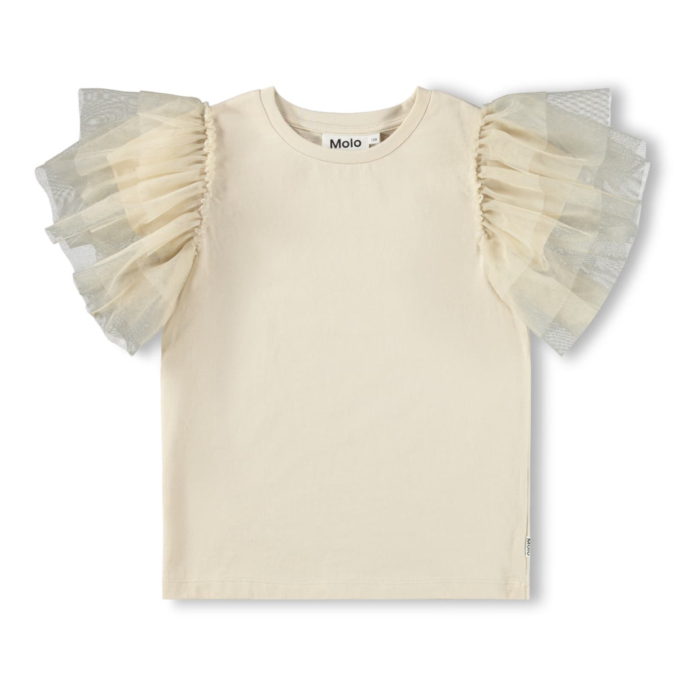 Ljós stuttermabolur með pífuermum. 100% bómull.