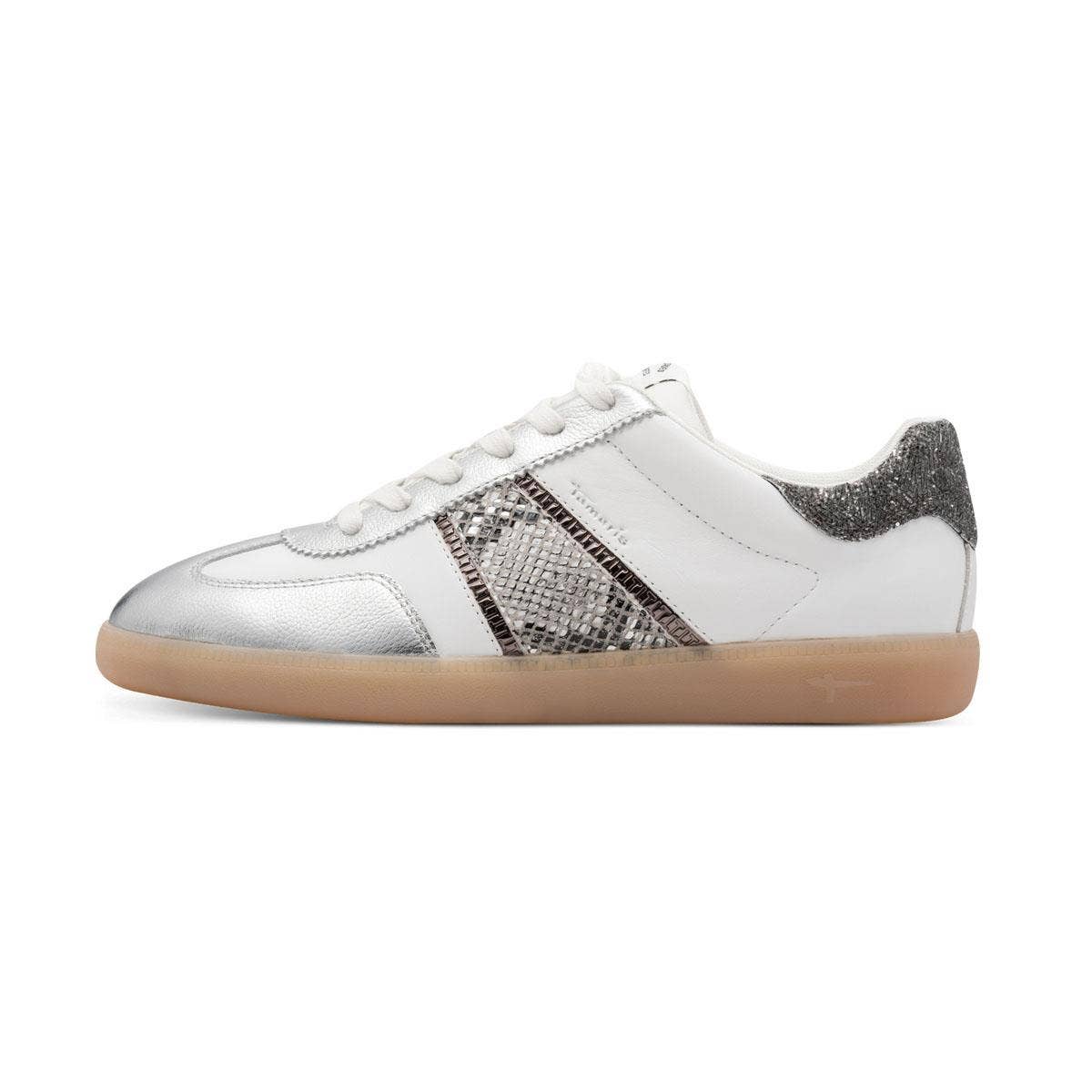 Vandaðir og flottir hvítir strigaskór frá Tamaris með skemmtilegum silfurlituðum skreytingum í mismunandi áferðum.