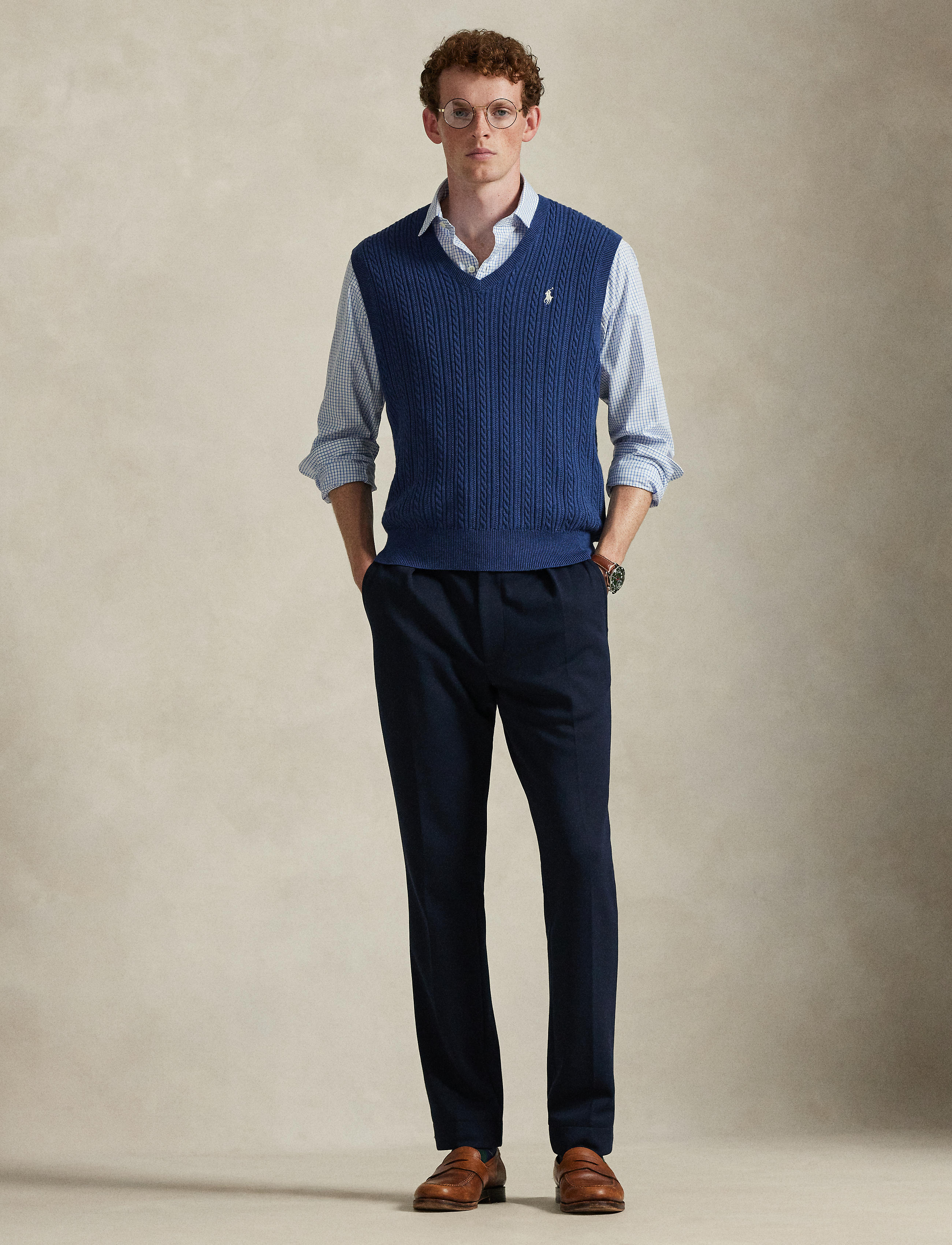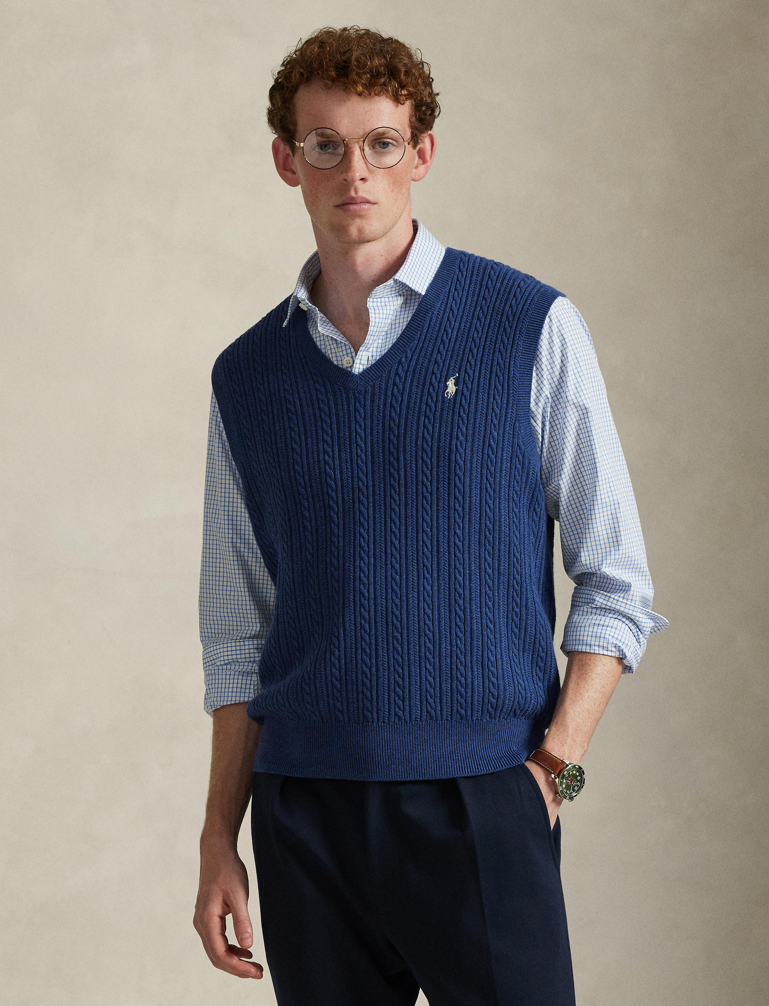 This sweater vest is cable-knit with featherweight cotton yarn that is combed with fine brushes, resulting in a softer, more durable garment. Regular Fit: wider at the chest while still ... Sjá nánar