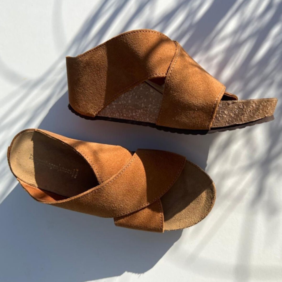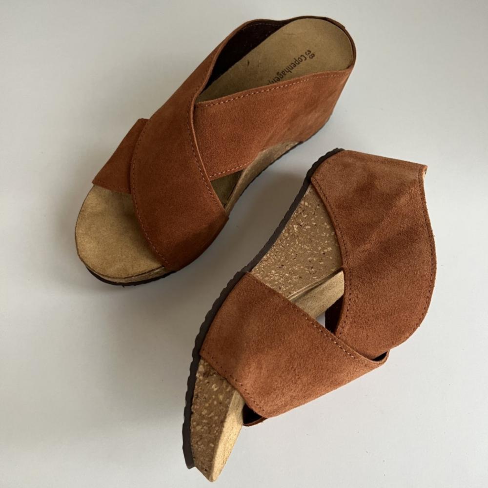 – Koníaksbrúnt – Ekta leður – Mjúkt leðurinnlegg – Gúmmísóli – Venjulegar stærðir – Hæll 6 cm Æðislegir wedge sandalar með gúmmíklæddum korksóla. Fallegt koníaksbrúnt rúskinn og ... Sjá nánar