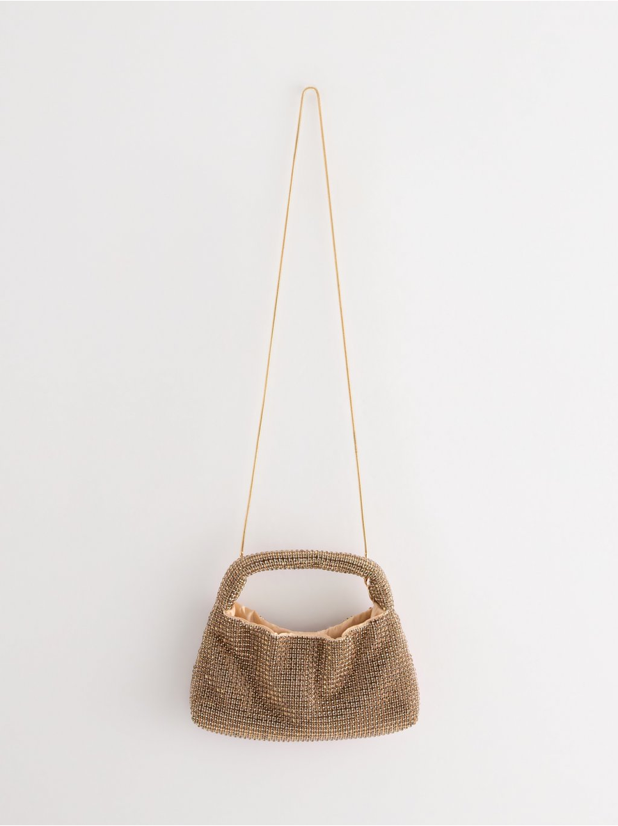 Sparkly bag with rhinestones and a short shoulder strap. It also comes with an extra detachable shoulder strap. Magnetic closure 100% gler