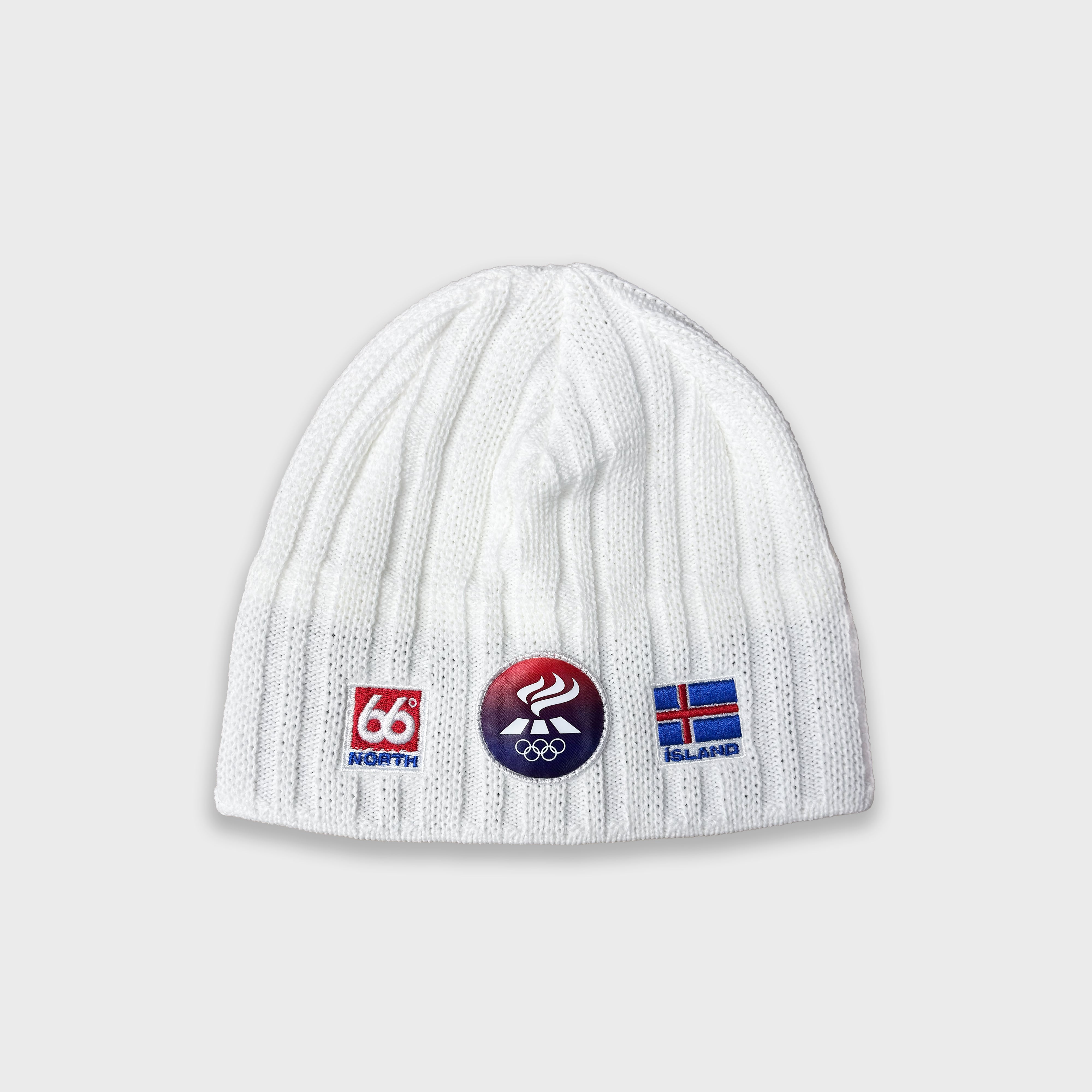Riffluð prjónahúfa innblásin af samstarfi 66°Norður og Íþrótta- og Ólympíusambands Íslands í tengslum við Vetrarólympíuleikana sem fara fram á Ítalíu í febrúar.