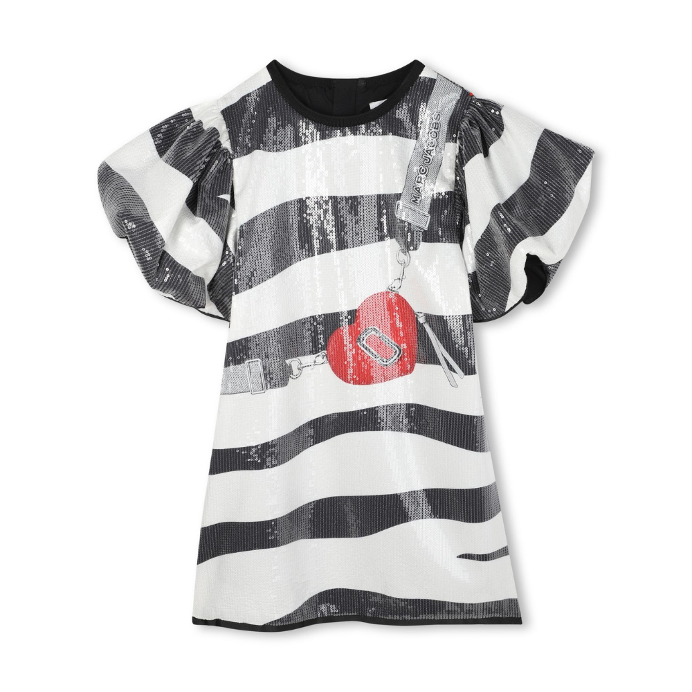 Röndóttur pallíettu kjóll frá lúxushönnuðinum Marc Jacobs. Kjóllinn er með víðum púff ermum og rúnuðu hálsmáli. Kjóllinn er fóðraður og með földum rennilás að aftan. 100% polyester.