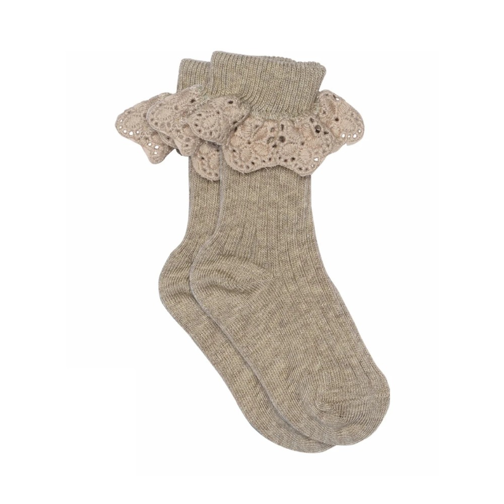 Fallegir, ljós brúnir bómullarsokkar frá MP með pífu við ökkla. 80% bómull, 17% polyamide og 3% elastane.