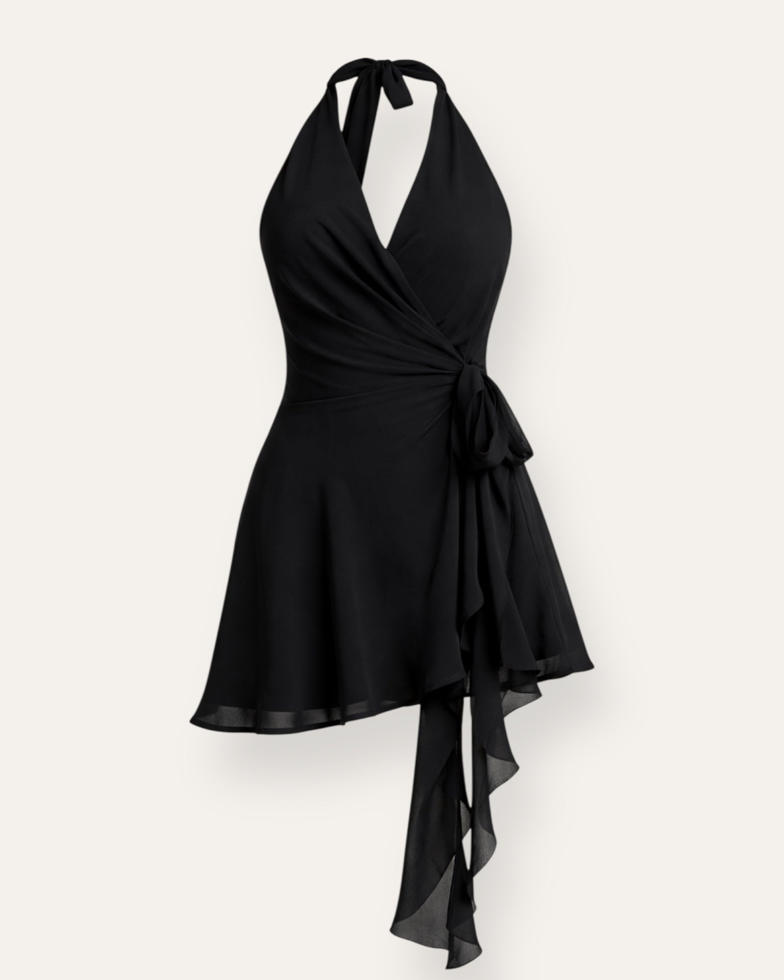 Svartur halter wrap kjóll Glæsilegur og kvenlegur halter kjóll með fallegu v-hálsmáli og opnu baki. Wrap snið með bundinni slaufu í mitti sem mótar fallega línu og létt, flæðandi pils með ... Sjá nánar