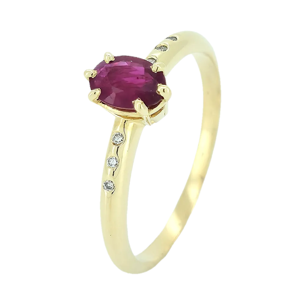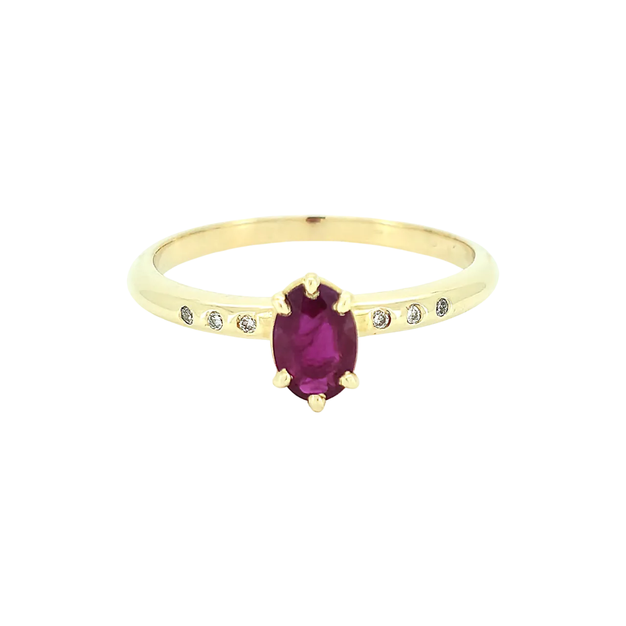 Efni hrings: 14kt gull Steinar: 6 demantar – 0,03ct – Top Wesselton VS | 1 rúbín - 0,5ct