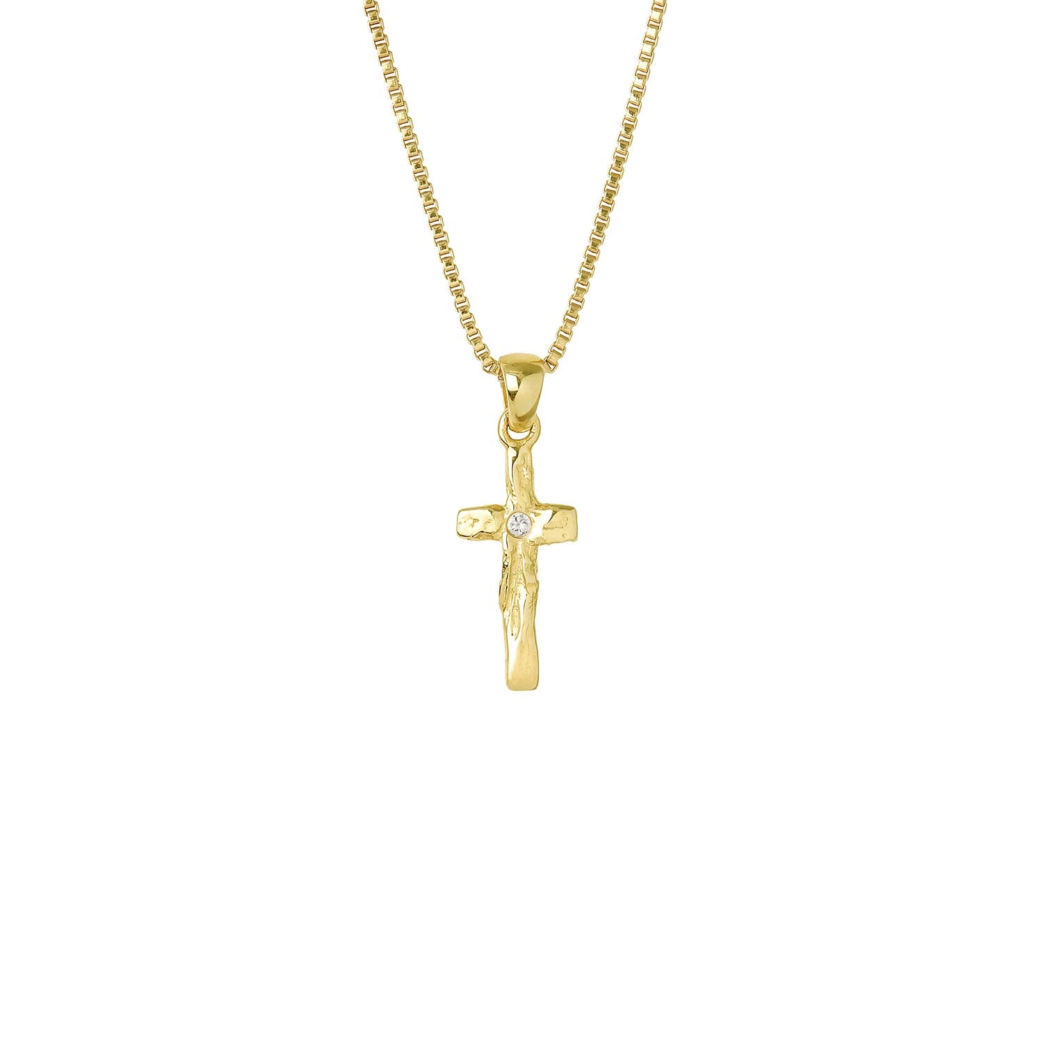 Krossinn er handsmíðaður úr 14 karta gulli með 2 punkta demanti í TW VS1 gæðum.  Hæð krossins er um 18 mm. Hönnuður og smiður er Berglind Snorra.