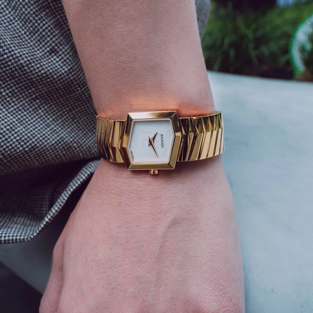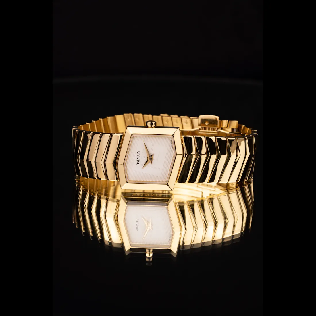 Úrkassi: 22,5mm – gyllt stál Úrverk: Rafhlaða – svissneskt Vatnsvörn: 30M Skífa: Hvít með PB Balmain logoi – vísar Gler: Safírgler – speglunarvörn Keðja: Gyllt stál - öryggislás Ábyrgð: Tveggja ára