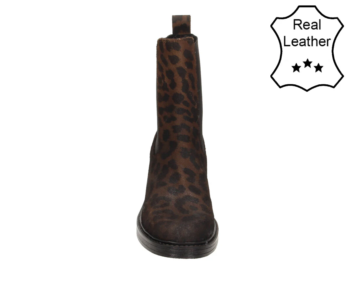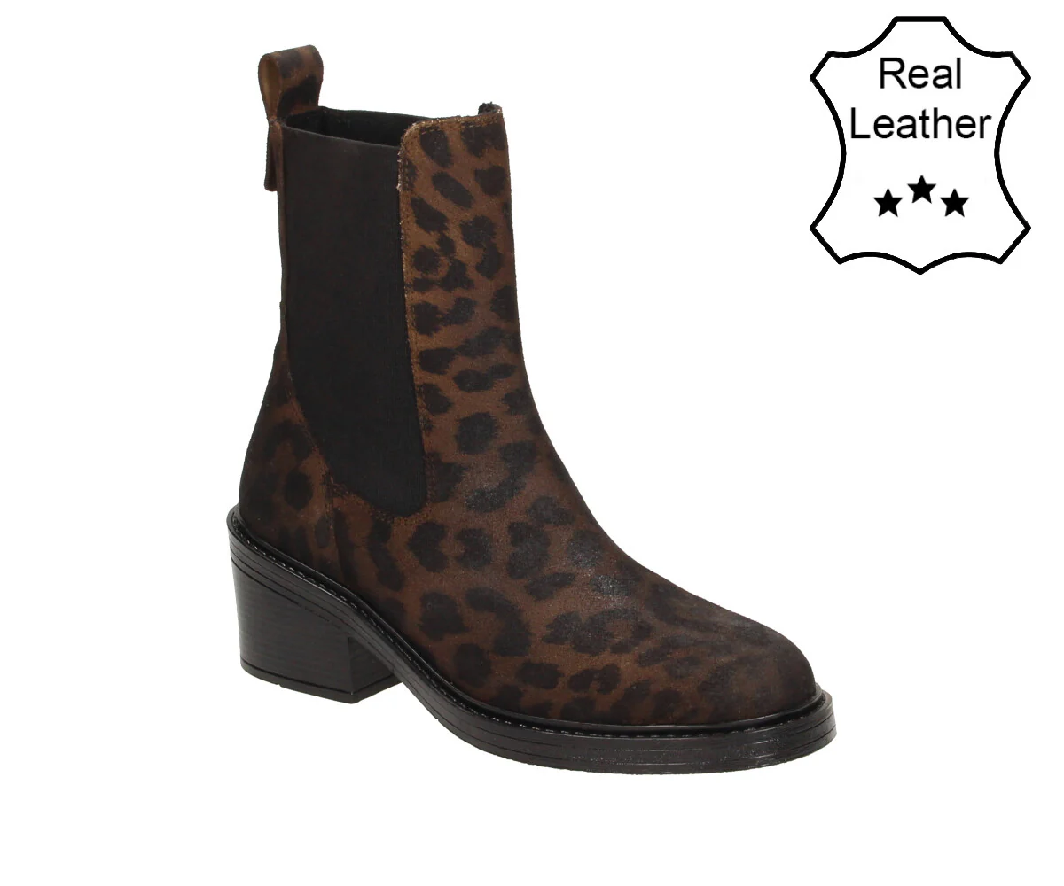 – Brúnt / leopard mynstur – Ekta leður að utan – Fóður að innan – Leðurinnlegg – Gúmmísóli – Venjuleg númer – Hæll 5 cm Æðisleg stílhrein chelsea stígvél sem að ná vel upp fyrir ökkla. ... Sjá nánar