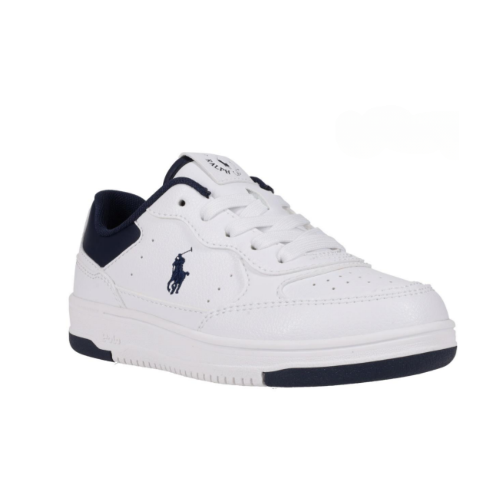 Hvítir og dökk bláir strigaskór frá Polo Ralph Lauren með útsaumuðu logo á hliðum. Skórnir eru reimaðir.