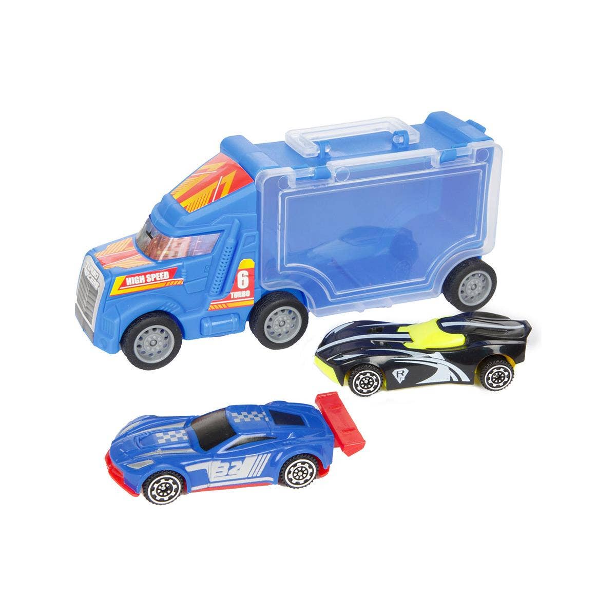 Trukkur sem er geymslutaska fyrir smábíla og inniheldur 2 litla sportsbíla.